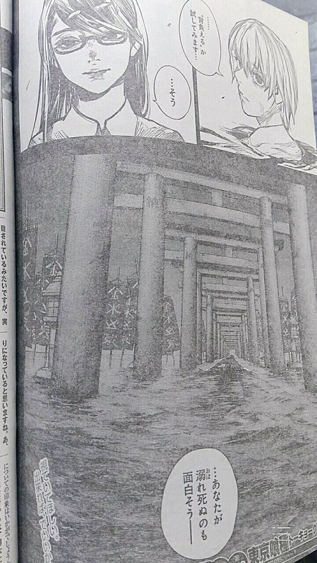 และสิ่งที่คาเนกิตัดสินใจหลังจากสงบสติอารมณ์อยู่ในเซฟโซนในโลกมโนของตัวเองกับริเสะ (มโน) ก็คือ...ว่ายข้ามทะเลเลือดที่ตัวเองเป็นคนทำเองไปเผชิญกับความจริง เพื่อทดสอบว่าตนเองจะ