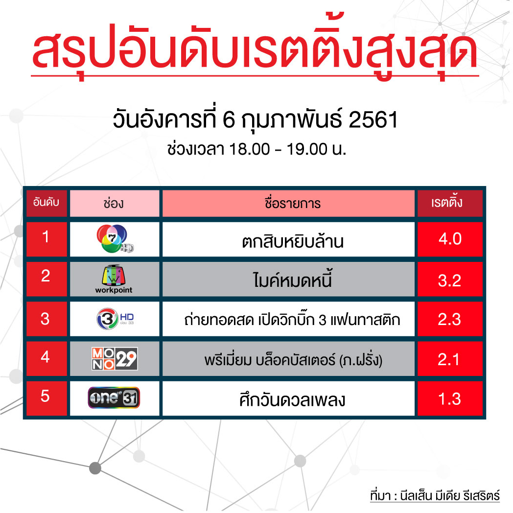 สรุปเรตติ้งสูงสุดประจำวันอังคารที่ 6 ก.พ. 61 ช่วงเวลา 18.00 - 19.00 น.