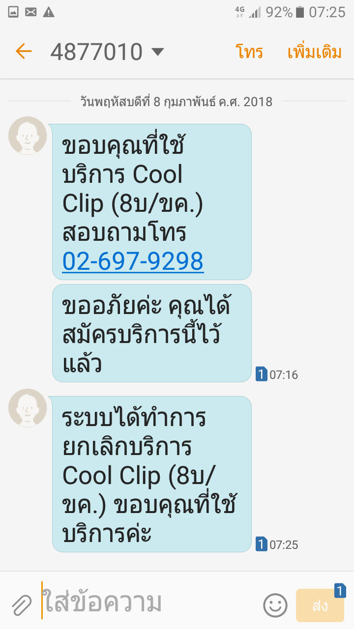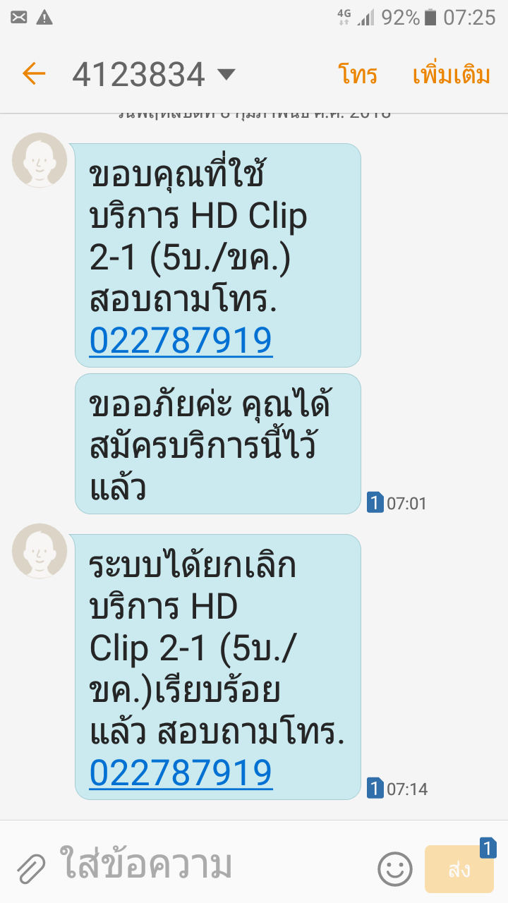 ใช้ดีแทค โทรไปแจ้งคอลเซ็นเตอร์และบอกพนักงานว่าให้ยกเลิกให้ด้วย หลังจากวางสาย ก็ยังมีส่งข้อความมาอีก จนต้องโทรไปยกเลิกอีกครั้ง สรุปโดนไป10บาท สองข้อความ และ6บาทค่าโทรหาคอลเซ็นเตอร์สองครั้ง และดีแทค*777