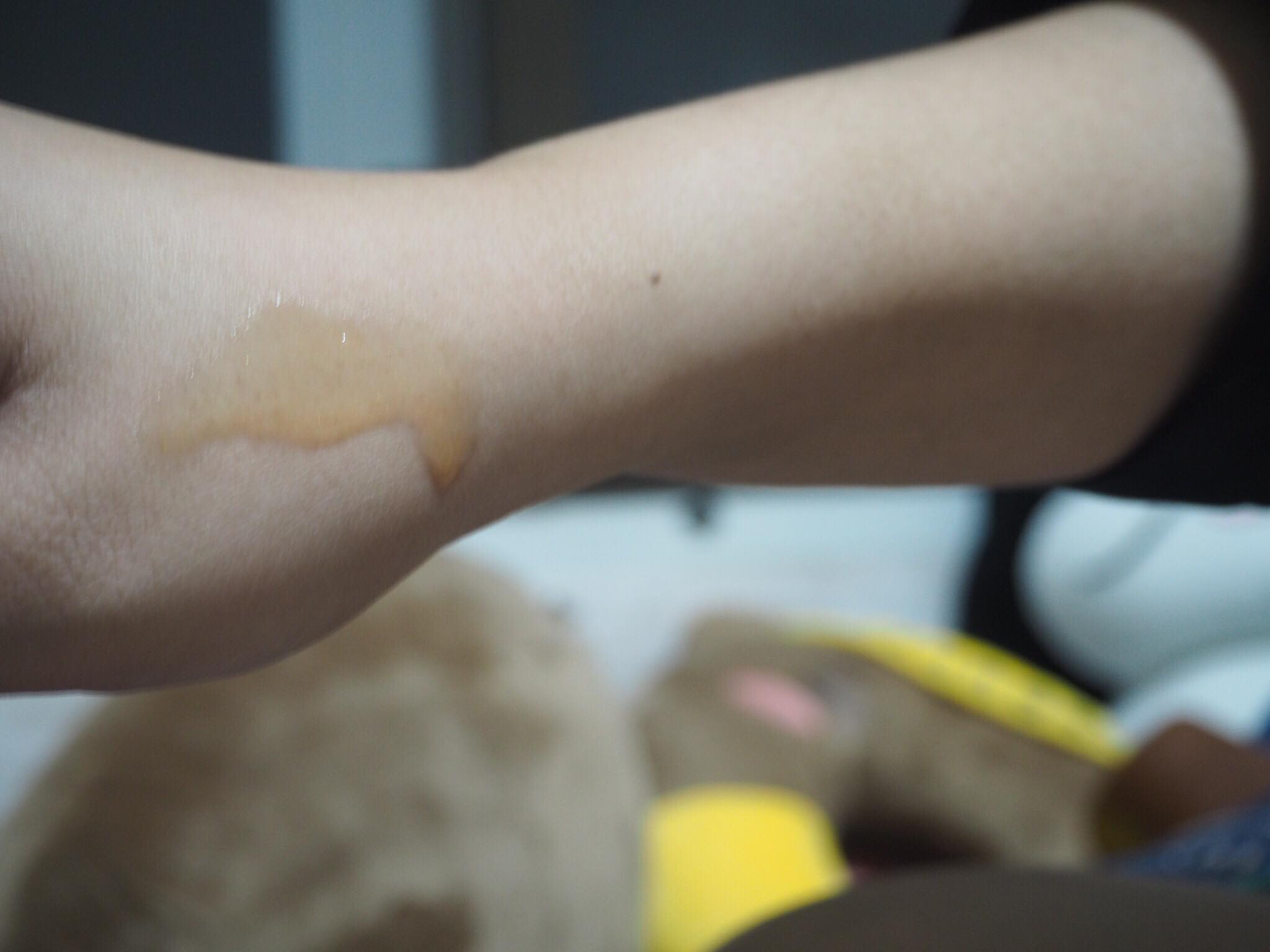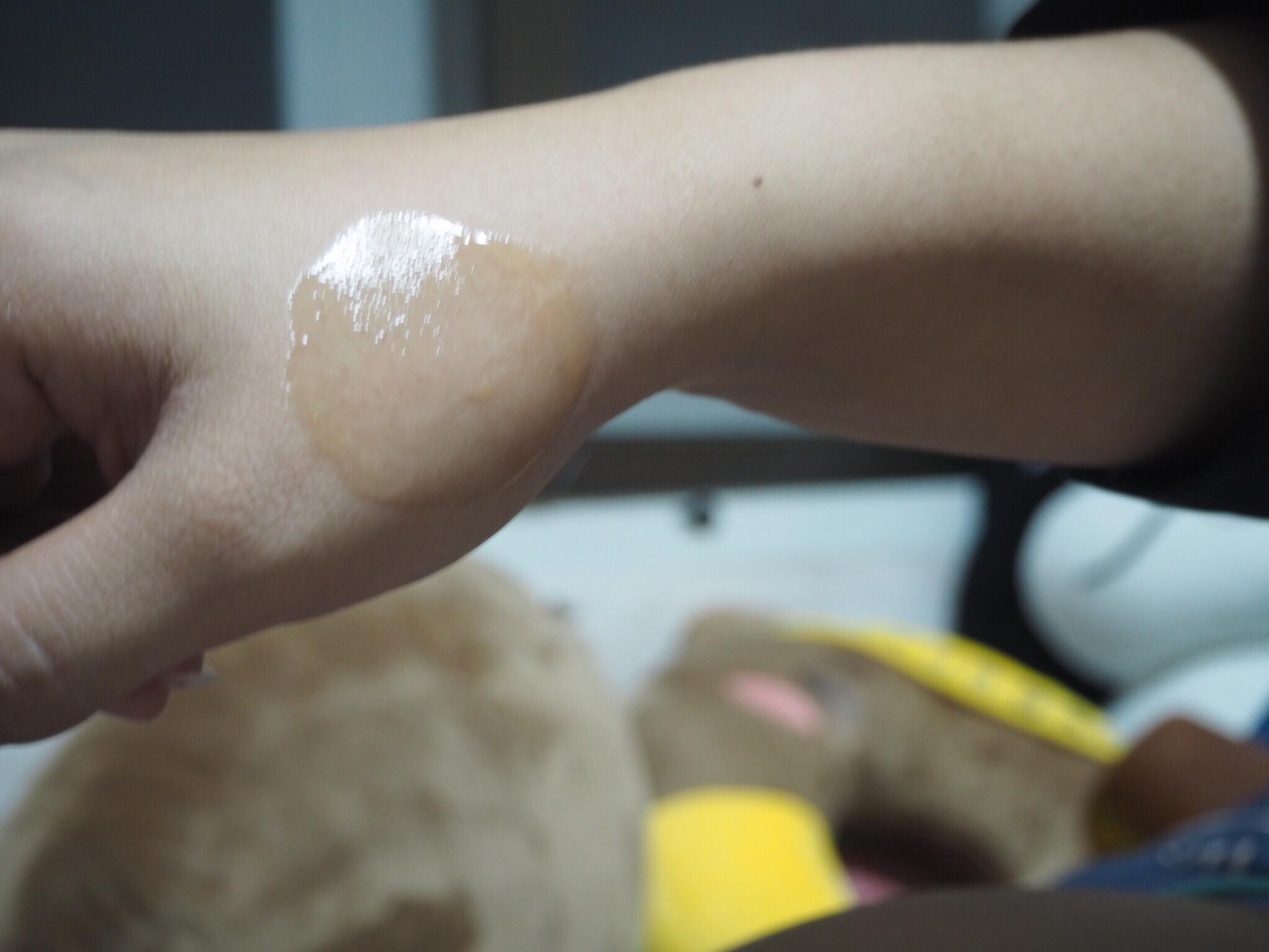 เมื่อเกลี่ยบนมือแล้วก็จะประมาณนี้ค่ะ มันจะไม่ได้ซึมไวมากนะคะ จะเป็นเหมือนเราทา พวก oil ทั้งหลายนั่นแหล่ะค่ะ