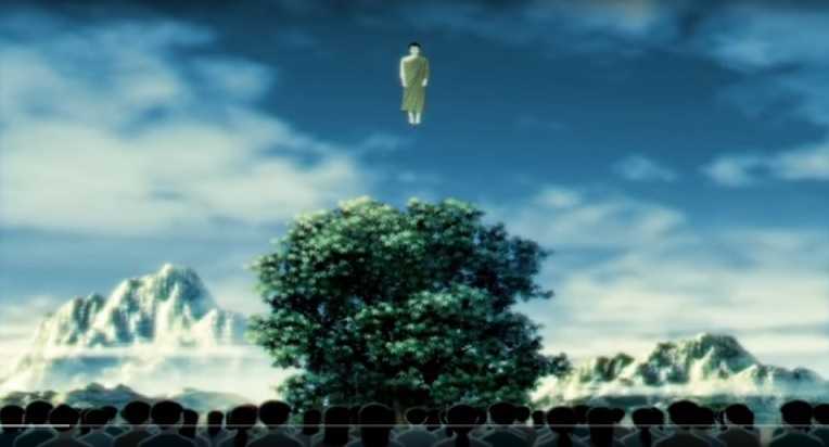 จากนั้น ทรงแลดูไปทั่วทุกทิศทั้งทิศตรงและทิศเฉียง เมื่อนั้น จักรวาลหลายแสน ก็ติดต่อเนื่องเป็นอันเดียวกันหมด เหล่าเทวดา มองเห็นพวกมนุษย์ ฝ่ายพวกมนุษย์ก็มองเห็นเหล่าเทวดา เหล่าเทวดาและมนุษย์ ต่างมองเห็นกันซึ่งๆหน้า