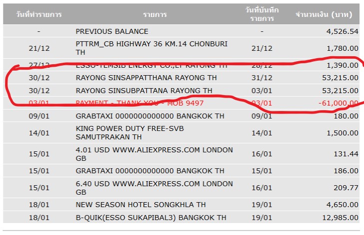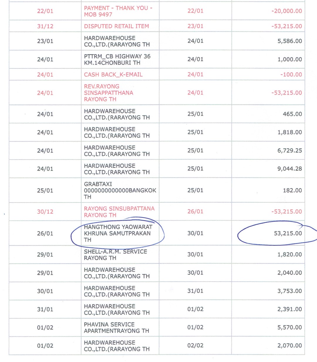 05.02.2561 ผมเข้ามาเชครายละเอียดการใช้บัตร ที่ยังไม่ได้เรียกเก็บ ปกติผมจะมาเชครายการ เพื่อจะได้จ่ายยอดถูก จะจ่ายก่อนมีใบเรียกเก็บ แล้วก็มาเจอรายการที่ผมไม่ได้ใช้ คือ Hangthong Yaowarat Khuna Samutprakarn TH ยอด 53,215 บาท ตกใจยอดนี้โผ่มาได้ยังไง เราไม่เคยซื้อทองนี้หว่า รายการอยู่รูปด้านล่าง