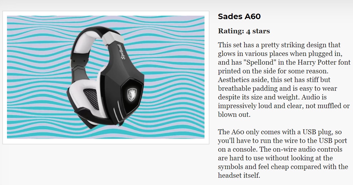 หูฟังเกมมิ่ง 7.1 ราคาถูก Sades Sa902 เป็นหูฟังที่ขายดีอันดับหนึ่งใน Amazon (อ้างอิงจากเว็บรีวิวค่ายดังอย่าง IGN http://www.ign.com/articles/2017/09/28/sades-sa902-71-usb-surround-pc-gaming-headset-review) ในปี 2017 ที่ผ่านมา และเป็นหูฟังที่ได้รับการรีวิวดีมากจากเว็บต่างประเทศต่างๆ เช่น:-