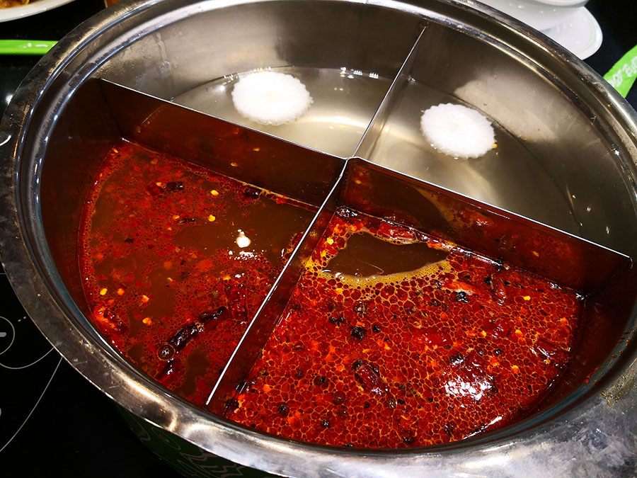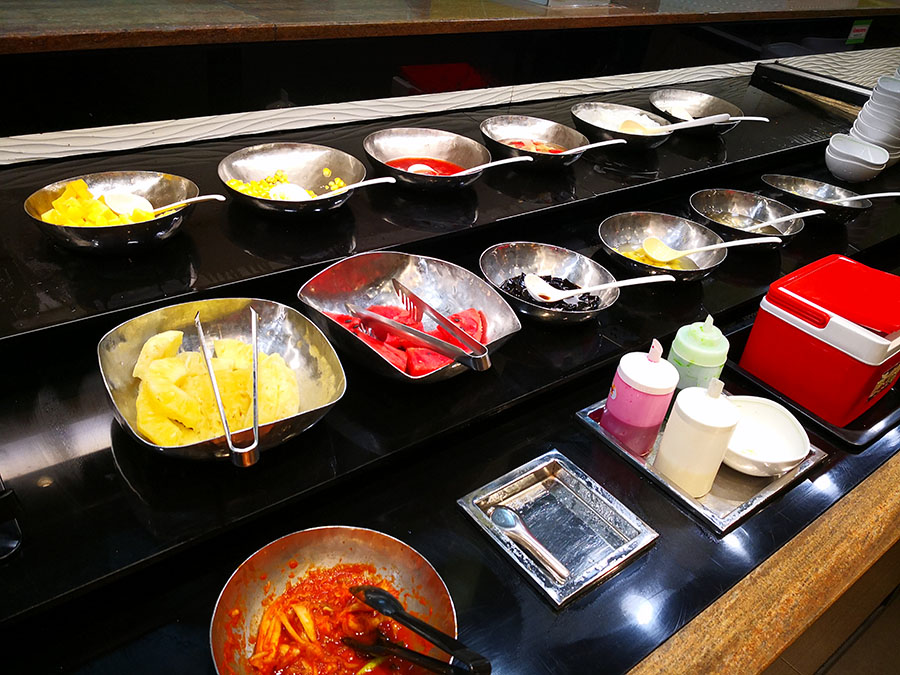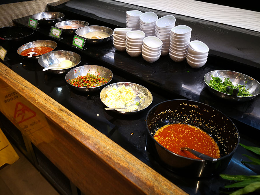 ในส่วนของน้ำซุป ที่นี่จะมีแบ่งให้ 4 ช่อง สามารถเลือกได้ตอนนี้จะมีซุปต้มยำ ซุปมิโซะ ซุปสุกี้ญี่ปุ่น ซุปซุปเปอร์ ซุปหม่าล่า และซุปใสธรรมดา เราอยากกินแต่หม่าล่ากับซุปใสเท่านั้น เพราะเคยเลือกน้ำซุปแบบอื่นแล้วไม่ค่อยถูกปากอ่ะ แต่พนักงานบอกว่าไม่มีแบบแบ่ง 2 ช่อง ก็เลยใส่น้ำซุปแบบเดียวกันอย่างละ 2 ช่องไปเลย