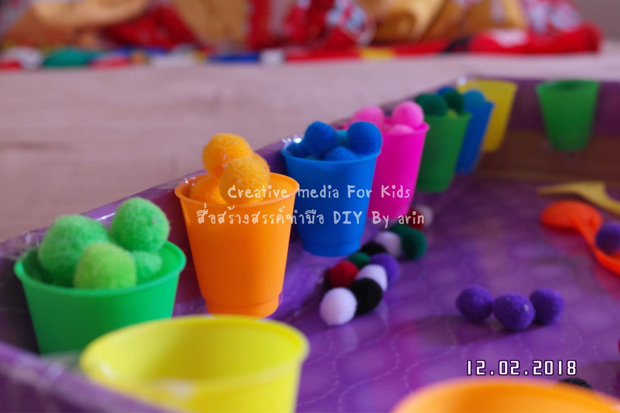 เซตที่ 1 เซตนี้แยกสีปอมปอมในถ้วยสีต่างๆ ลูกชิบปอมปอมเป็นทุนเดิมอยํ่แล้ว เด็กทุกคนล่ะค่ะเราว่า มันเบา นุ่มนิ่มสีสดใส เรายังอบเลย ส่วนแก้วก็ซื้อจากร้านหนังสือ 1 สีมี 8 แก้วราคาประมาณ 35 บาทต่อสีค่ะ เซตนี้ลงทุนกับแก้วหน่อยเพราะคิดว่สมันทำได้หลายอย่างมากๆ ต่อยอดได้อีกค่ะ
