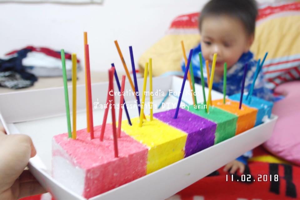 เซตนี้แม่ชอบมากค่ะ พอดีเดินขึ้นบ้ายไปห้องเห็บของค้นๆว่าจะทำอะไรให้ลูกดีเลยไปค้นเจอกล่องตู้เย็นแล้วเห็นโฟมกันกระแทกในนั้น เสร็จแม่ค่ะ ... จัดการระบายสีตามสีไม้เสียบลูกชิ้นอีกที ตากแดดให้แห้งก็เล่นได้แล้วค่ะ ลูกชอบเล่นมากกกกที่สุดเล่นนานอยู่ 2 ชม จนโฟมหัก พังไปเลย5555