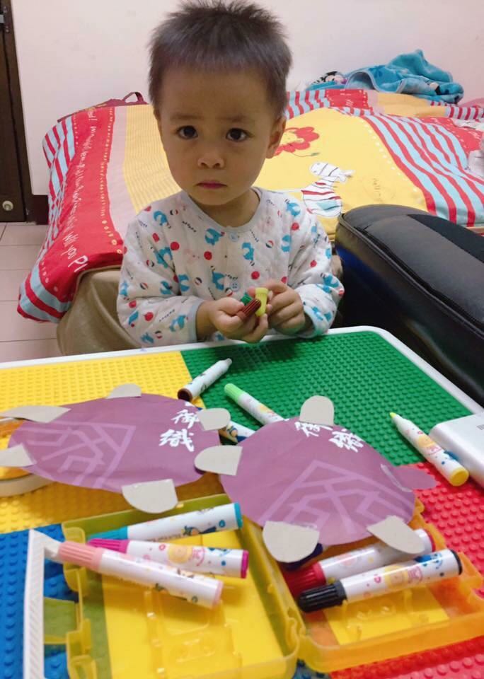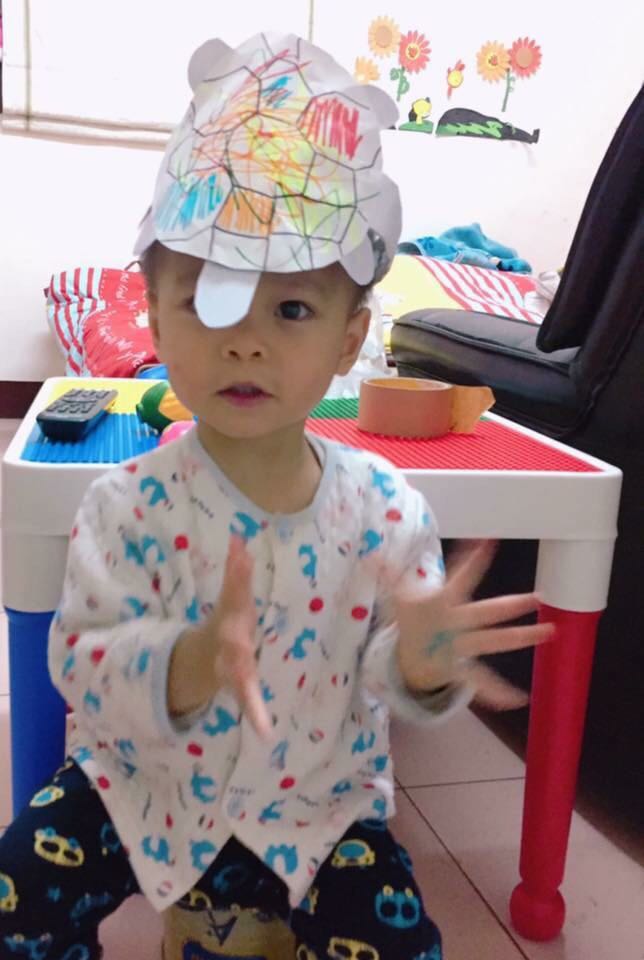 เห็นวิ่งไปมาดีนักเลยเอาถุงกระดาษมาตัดๆเป็นทรงกลมแล้วต่อหัว ขา กบายเป็นเต้าพาระบายสีเมจิกเล่น นิ่งเลยค่ะได้ผล เล่นกับแม่นานเป็น ชั่วโมงเชียว