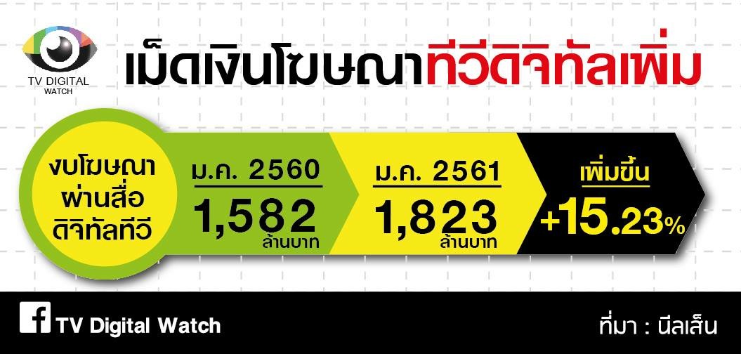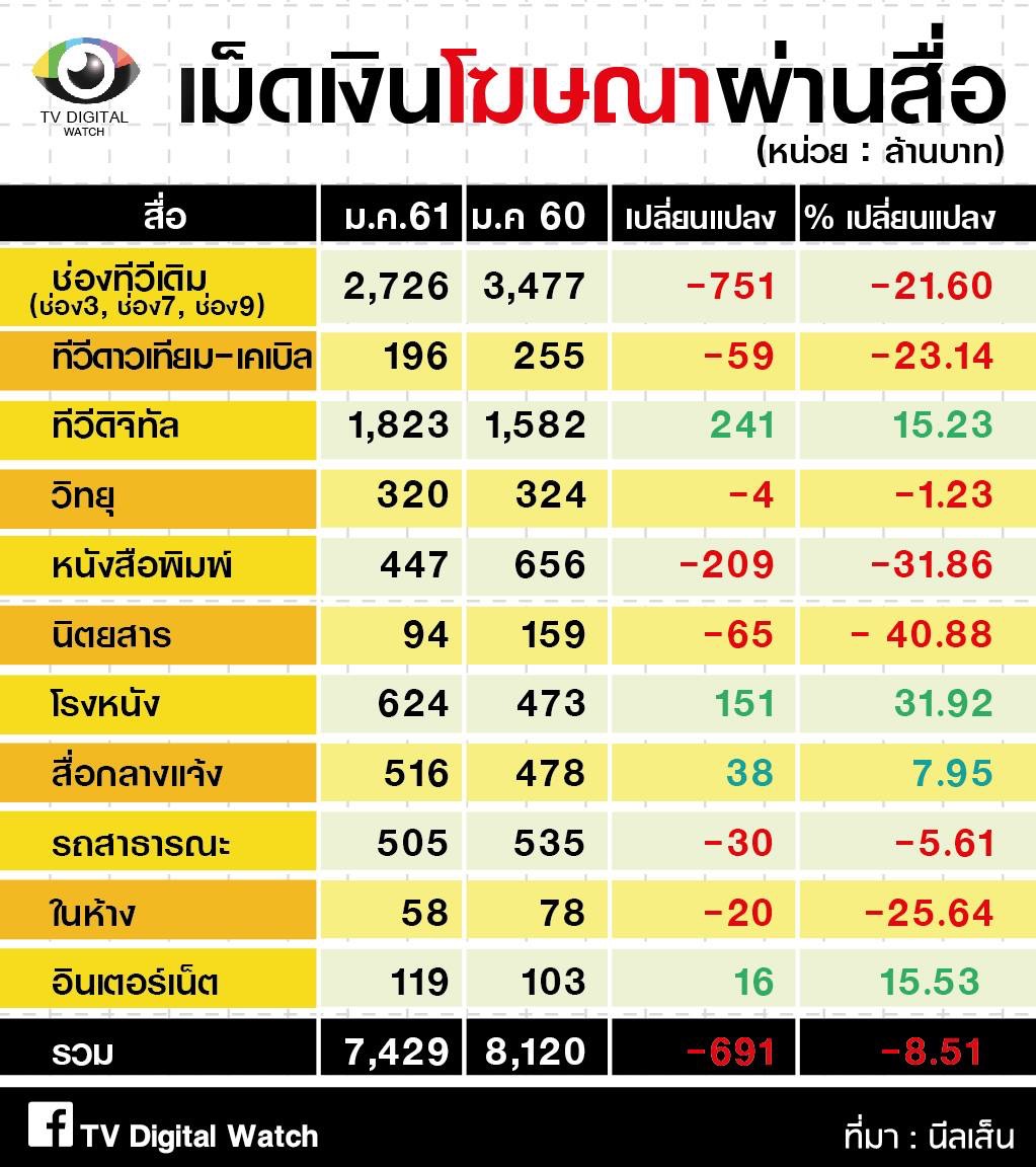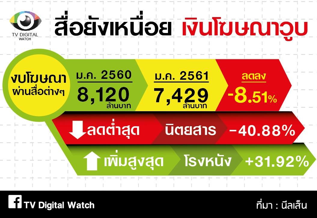 เม็ดเงินโฆษณา เดือนแรกของปึ 2561 สื่อต่างๆ ได้เงินน้อยกว่าเดือนแรก 2560 ประมาณ 691 ล้านบาท คิดเป็น 8.51%