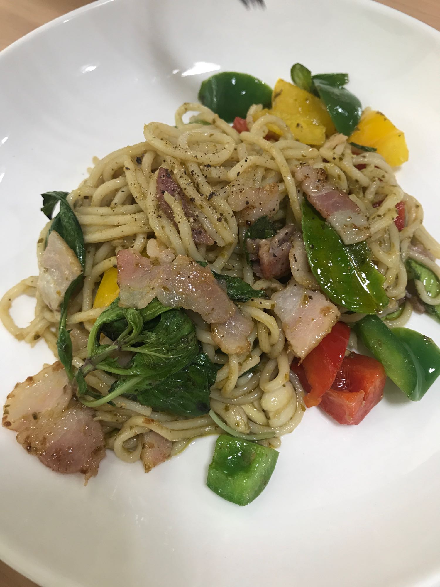 จานแรกมาแล้ว Spaghetti Bacon Pesto Sauce (200 บาท) ตอนแรกคิดว่าเป็น creamy pesto ที่แท้เป็นผัดแบบไทยๆใส่กระเทียมค่ะ คือสำหรับเมนูนี้จะบอกว่าเส้นเปื่อยไปมากเหมือนต้มนานไปแล้วเอาไปผัดให้ยิ่งสุกขึ้นอีก สำหรับซอสที่ผัดเค็มไปหน่อยค่ะ มีความเป็น pesto น้อย แล้วก็ส่วนตัวคิดว่าไม่น่าเอาพริกหยวกสีต่างๆมาผัดรวมด้วย เพราะกลิ่นของพริกหยวกมันไม่ค่อยเข้ากับเมนูนี้ค่ะ (ความเห็นส่วนตัวนะคะ)... อ่อ อีกอย่างคือปริมาณน้อยไปมากค่ะ ถ้าทานอย่างเดียวคือไม่อิ่มแน่นอน
