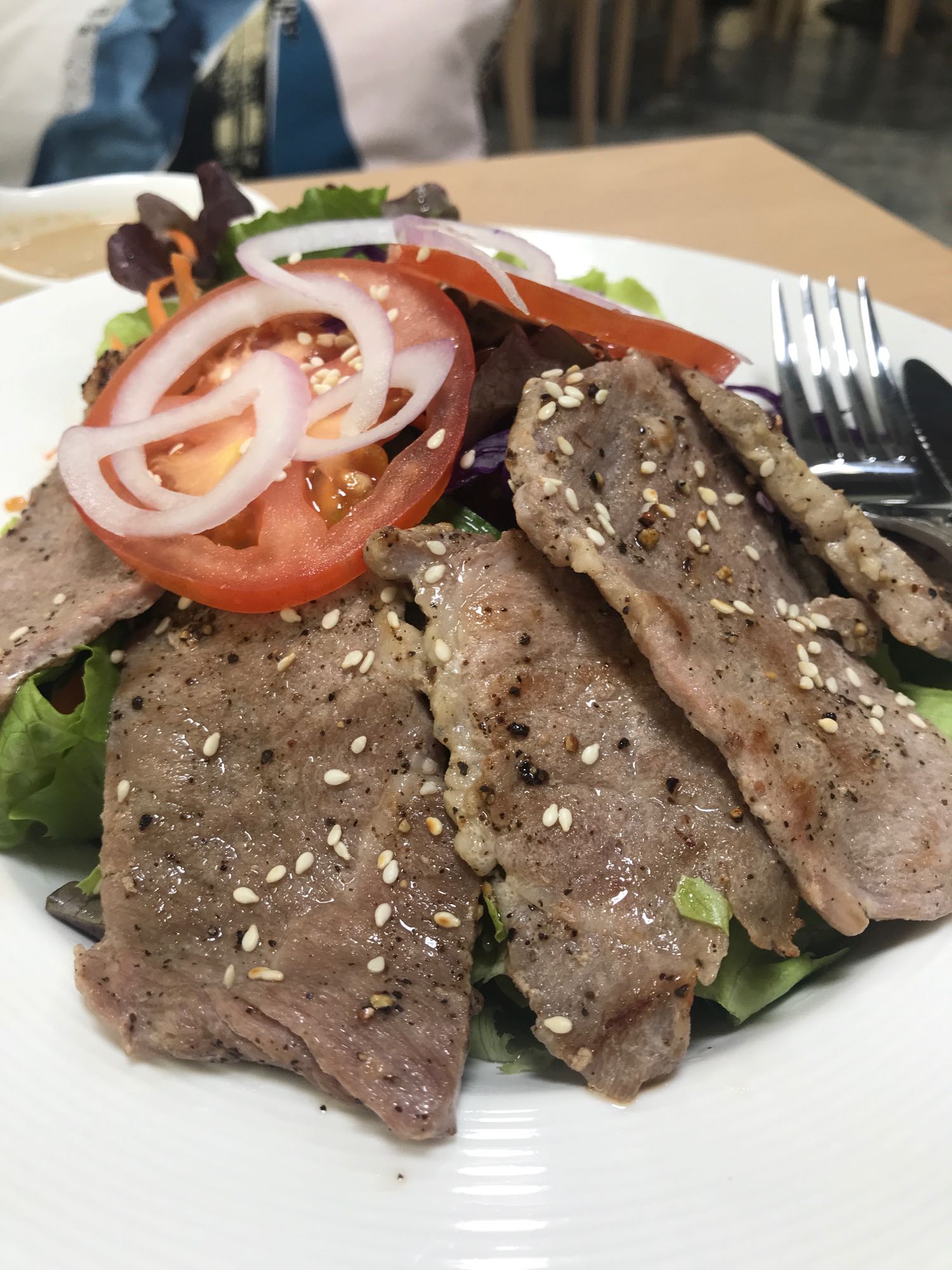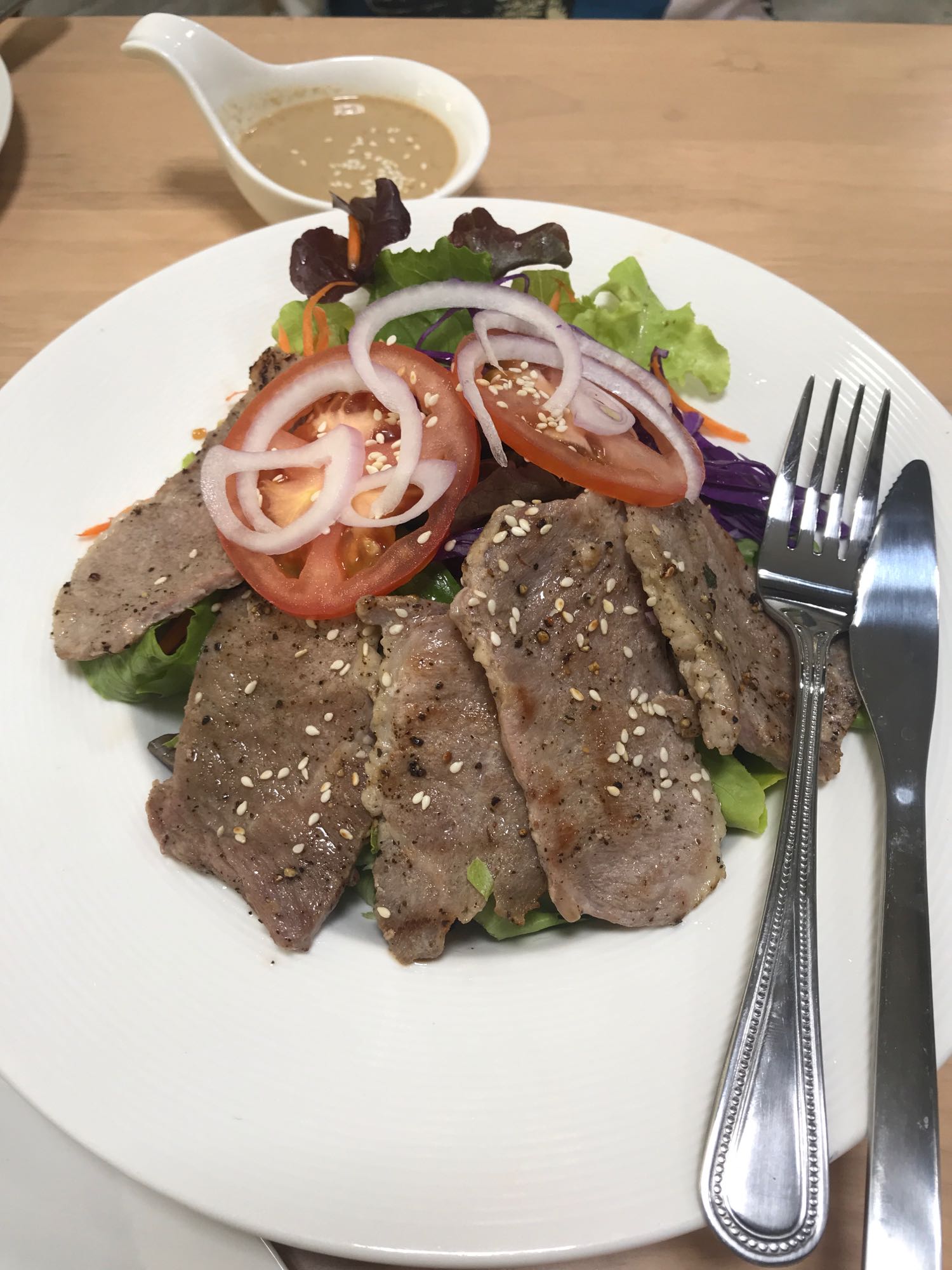 สลัดหมูย่าง (190 บาท) เห็นเป็นเมนูแนะนำด้วย รูปหมูในเมนูดู juicy มากๆๆๆ แต่ของจริงหมูจะย่างมาแห้งๆค่ะ คือมันแห้งแต่ก็ไม่ได้แข็งมาก แต่จะจืดๆหน่อยค่ะ ส่วนประเภทผักที่ให้มาก็ยังไม่หลากหลายนะคะ อาจจะเพราะยังไม่พร้อม 100% รึเปล่าไม่แน่ใจ เพราะผักตรงบาร์ก็มีนิดๆหน่อยๆค่ะ ส่วนน้ำสลัดเลือกได้จาก 3 แบบคือ ซีซาร์, thousand island และงาญี่ปุ่น... เราเลือกงาญี่ปุ่นมาแต่รู้สึกว่ารสชาติเหมือนมีถั่วและขิง เหมือนเครื่องเมี่ยงค่ะ ไม่ค่อยชอบค่ะ