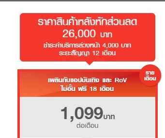 3. ส่วนลดค่าเครื่อง 7,000 บาท ราคาหลังส่วนลดเหลือ 26,000 บาท ชำระค่าบริการล่วงหน้า 4,000 บาท (ใช้เป็นส่วนลด 400บาท นาน 10 เดือน) โปรโมชั่นที่ร่วมรายการ 4G Plus FUN Unlimited Extra 1099 สัญญาการใช้งาน 12 เดือน