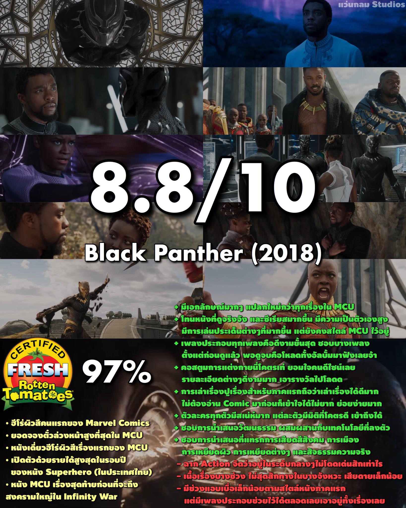 " หนังมีความเป็นตัวเองสูงมากกกกก โคตรมีเอกลักษณ์ คือไปได้สุดในการนำเสนอเอกลักษณ์จริงๆ แต่ถามว่าดีที่สุดใน MCU ไหม? สำหรับผมยังไม่ขนาดนั้น แต่ไม่ใช่ว่าไม่ดี สำหรับผมให้เป็นหนังฮีโร่ภาคแรกที่เปิดตัวได้ค่อนข้างสวยงามเลย ปูเรื่องภาคแรกได้ดีเยี่ยมจริงๆ ชอบการเล่นประเด็นต่างๆในหนังมาก ทั้งการเหยียดสีผิว เหยียดอะไรต่างๆนาๆ การเมือง ดราม่า สัจธรรมต่างๆ โคตรอิน ชอบวัฒนธรรม เทคโนโลยีต่างๆที่ผสมผสานกันอย่างลงตัว และที่ไม่พูดถึงไม่ได้เลยคือ เพลงประกอบของหนังที่ดีงามรามแปดเว่ออออ ตอนก่อนดูผมฟังแค่บางเพลงนะ ก็แบบเพราะดีผ่านๆไปไรงี้ พอเข้ามาดูในหนังแล้วโคตรว้าว เพลงมันเหมาะมากกกก จังหวะลงตัว อะไรต่างๆ (หรือฟังในโรงมันมีมนต์สเน่ห์ไว้55555) สำหรับตัวละครต่างๆนี่เรื่องนี้เอาอยู่มาก แม้ตัวละครจะเยอะแต่นำเสนอได้อย่างมีชั้นเชิง มีมิติมากๆแต่ละตัว ถ้าเอาชอบที่สุดในเรื่องนี้ ก็คงเป็น Shuri (หลงเลยอะ มีสเน่ห์มากๆ อยากเห็นเธอใน Infinity War จังเลย และอยากเห็นในเรื่องต่อๆไป ติดตาม), ฝ่าบาท (คนนี้ไม่ต้องพูดถึง ชอบสุดๆ55555 ไม่ต้องหาเหตุผลเพราะเห็นๆกันอยู่ ) และ Killmonger (ตัวร้ายที่โคตรเท่ และมีมิติมากๆ ให้เป็นตัวร้ายอันดับต้นๆใน MCU เลย) เอาเป็นว่าโดยรวมชอบมากครับ กลายเป็นฮีโร่ที่ชอบอันดับต้นๆใน MCU ซะแล้ว "