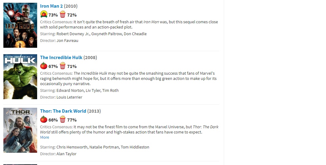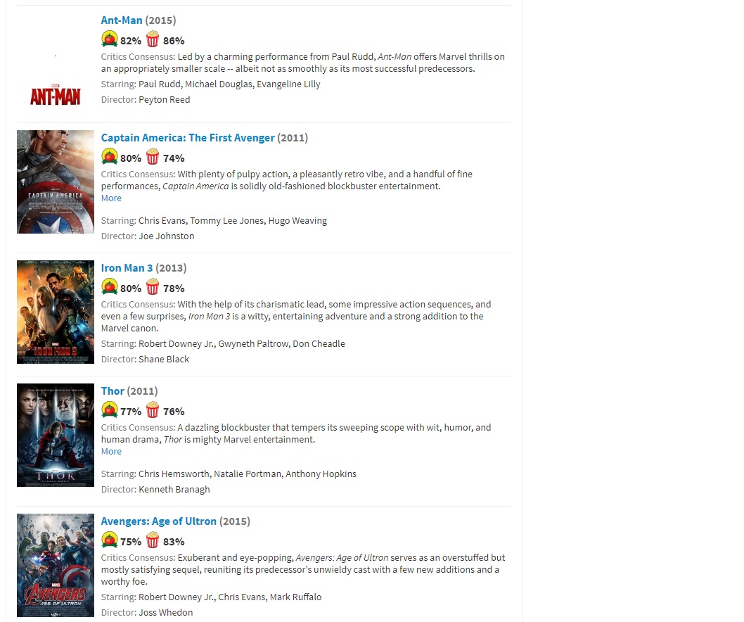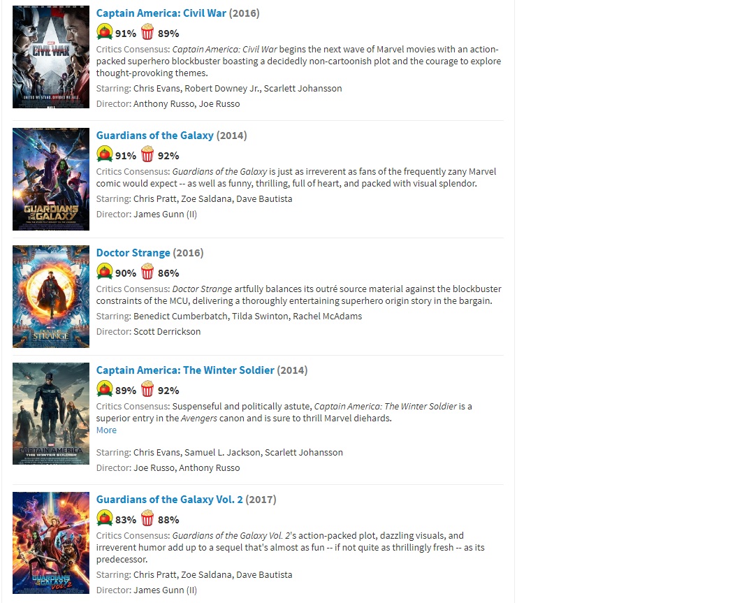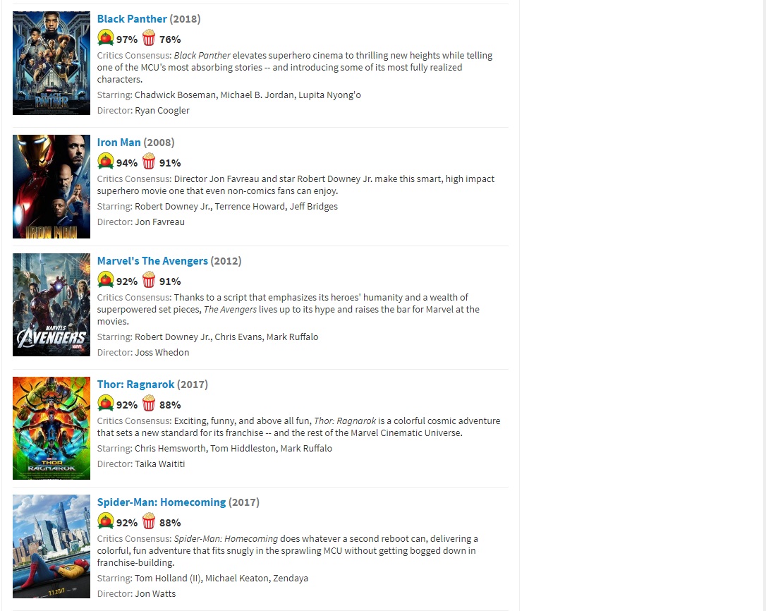 จากรูปนะครับก็จะเห็นได้ว่า ณ ตอนนี้ คือเป็นหนัง MCU ที่ได้รับ % สูงที่สุดไปแล้ว (แต่สักพักก็จะลดลงมาเรื่อยๆแหละแต่คงไม่หลุด 90% แล้วแหละแต่จะมาลุ้นกันต่อว่าจะเป็นอย่างไร ) ซึ่งถ้าเอาจริงๆ สำหรับผม หนัง MCU ที่ผมชอบสุดก็ไม่ใช่เรื่องนี้หรอกครับ แล้วก็ไม่ใช่ Ironman 1 ด้วย แต่ขอไม่บอกละกัน5555 เอาเป็นว่าก็ดูกันสนุกๆ ลุ้นกันขำๆ จากกระแสคนทั่วโลกไปงั้นแหละครับ สุดท้ายก็อยู่ที่ตัวคุณเองว่าชอบไหม?
