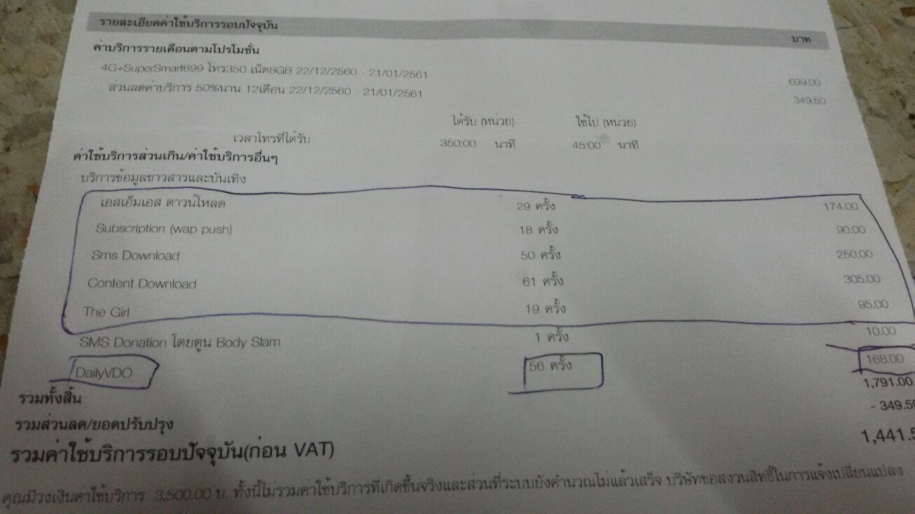 เรื่องมีอยู่ว่า ประมาณปลายเดือน ธ.ค. ปีที่แล้วโทรศัพท์ผมเริ่มมี SMS ประมาณสาวเซ็กซี่ 5/คลิป หรือคลิปหลุดนู้นี่นั้น 5/คลิป อะไรทำนองนี้ส่งมา 4-7 SMS ต่อวัน ด้วยความที่เราไม่สนใจก็เปิดดูแล้วก็ลบไปแบบนี้ทุกวันๆ เพราะคิดว่าไม่เคยสมัครอะไพวกนี้ไว้คงเป็น SMS โฆษณาทั่วๆไปไม่เสียตัง จกระทั้งบิลค่าโทรศัพท์มาถึง โอ้แม่จ้าว มียอดชำระ 1441.50 บาทจากปกติ 345 บาท(ได้ส่วนลดค่าโปร) ผมตรวจสอบสิ่งผิดปกติทันทีปรากฏว่ายอดชำระที่เกินมาจากค่า SMS ขยะพวกนี้ ผมจึงโทรสอบถามไปทาง Cellcenter ทันทีว่าเกิดอะไรขึ้น หลังจากตรวจสอบแล้วปรากฏว่า ผมมีดารสมัคร SMS ผ่านทาง POPUP POPUP อะไรหว่า งง