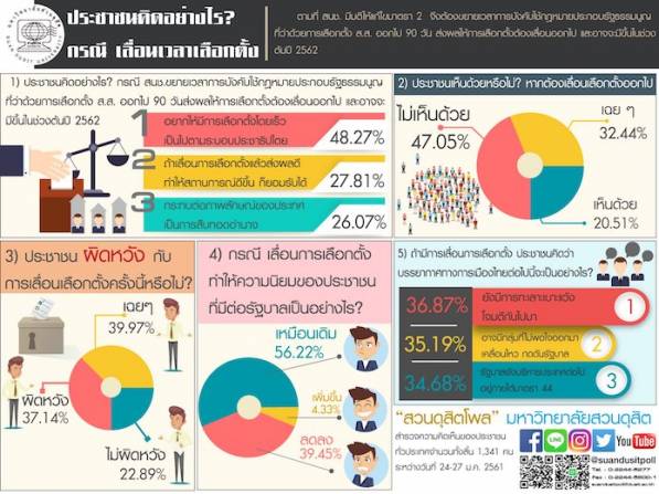 1) ประชาชนคิดอย่างไร? กรณี สนช.ขยายเวลาการบังคับใช้กฎหมายประกอบรัฐธรรมนูญที่ว่าด้วยการเลือกตั้ง ส.ส. ออกไป 90 วัน ส่งผลให้การเลือกตั้งต้องเลื่อนออกไป และอาจจะมีขึ้นในช่วงต้นปี 2562