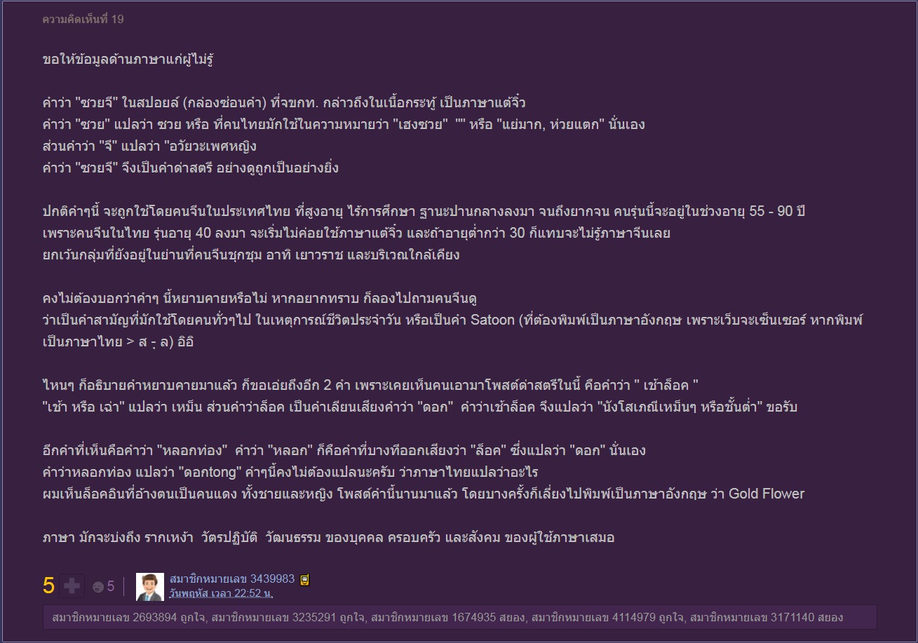 .................................... นับร้อย ๆ คห. ที่สุดหยาบคาย แต่ขอยกมาเป็นตัวอย่างแค่ส่วนเสี้ยว เพราะไม่สามารถยกมาเยอะได้ หยาบคายเกินคน ขอบคุณลุงโอลด์ ที่กรุณาช่วยอธิบายความ