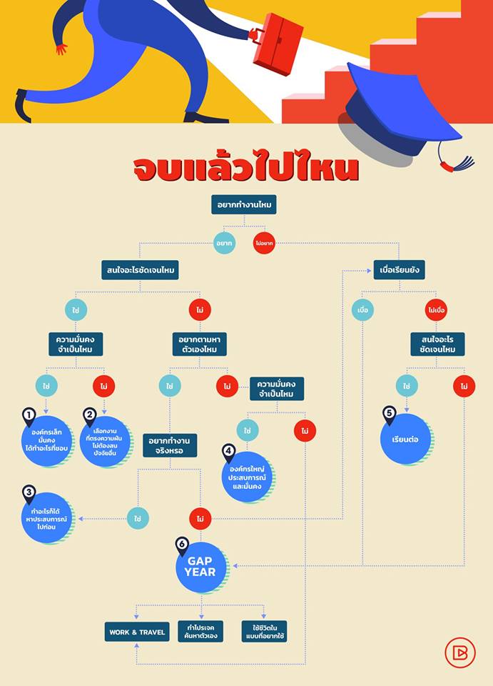 5. และ 6. ส่วนใครคิดว่ายังไม่อยากหรือยังไม่พร้อมกับการทำงาน ลองถามตัวเองต่ออีกสักนิดว่ามีความสนใจด้านไหนเป็นพิเศษไหม ถ้ามีก็ลองถามตัวเองดูว่าเบื่อการเรียนแล้วหรือยัง เพราะถ้ามีสิ่งที่ชอบชัดเจน การเรียนต่อในด้านนั้นไม่ว่าจะเรียนต่อในประเทศไทยหรือในต่างประเทศก็เป็นไอเดียที่ดีเลยทีเดียว หรือถ้าใครเบื่อการเรียนแล้ว แต่ยังหาตัวเองไม่เจอสักที ลองใช้ Gap Year ไปทำอะไรมันๆ ดูสักปีก็ได้ครับ ถึงแม้ว่ามันจะไม่เป็นที่นิยมในโซนเอเชีย แต่ลึกๆ แล้วการใช้เวลา 1 ปีไปค้นหาตัวตนเป็นอะไรที่ค่อนข้างคุ้มค่ากว่าการยอมทำงานที่ตัวเองไม่ชอบไปทั้งชีวิตแน่นอนครับ