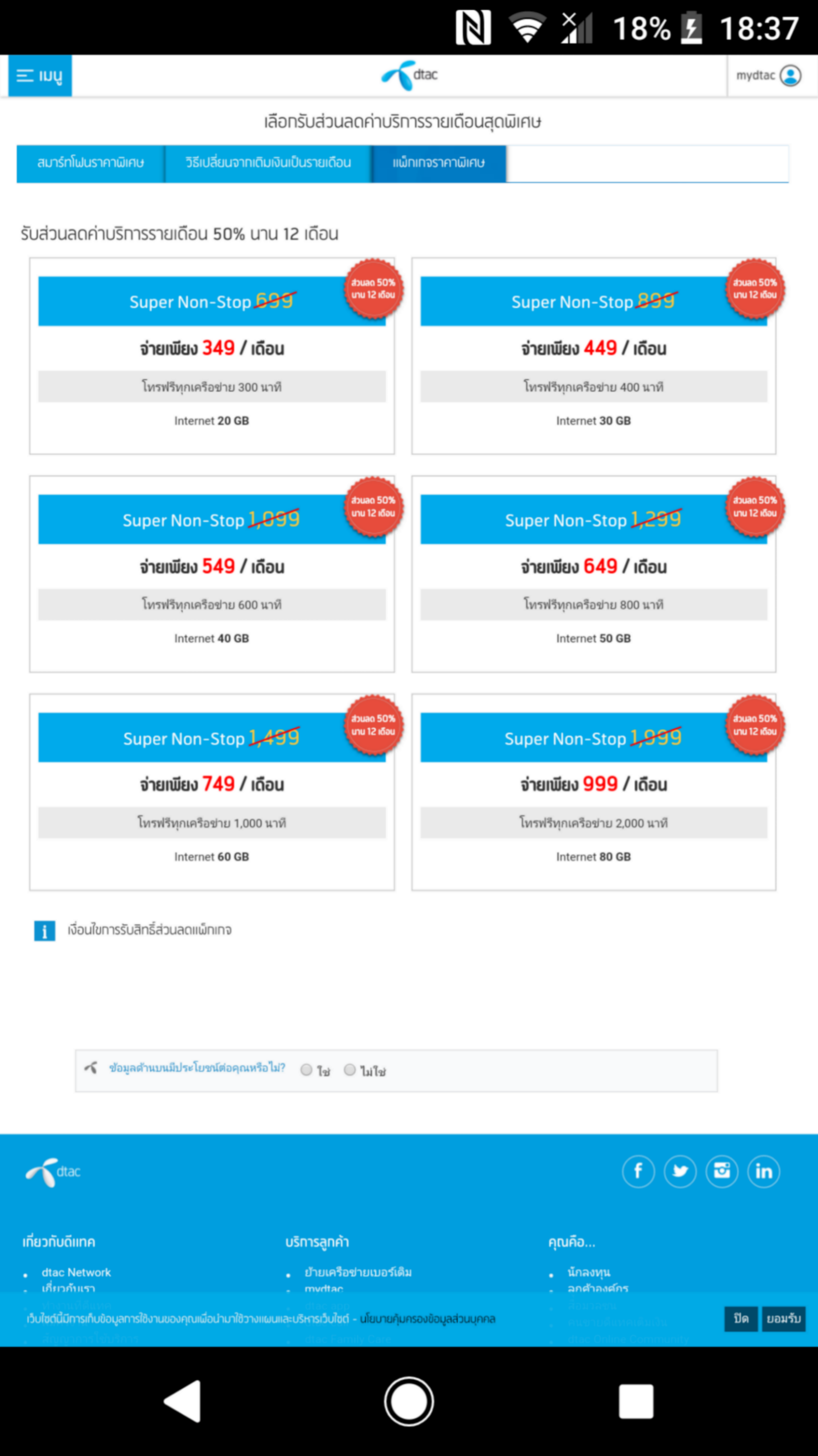 อย่างผมเปลี่ยนจากระบบเติมเงินเป็นรายเดือน ใช้โปรฯ 399 บาท ได้ส่วนลด 50% 12 เดือน และจะครบกำหนด 12 เดือน ในเดือนหน้า ขออนุญาตถามว่า ส่วนลด 50% สามารถต่อได้อีกไหม