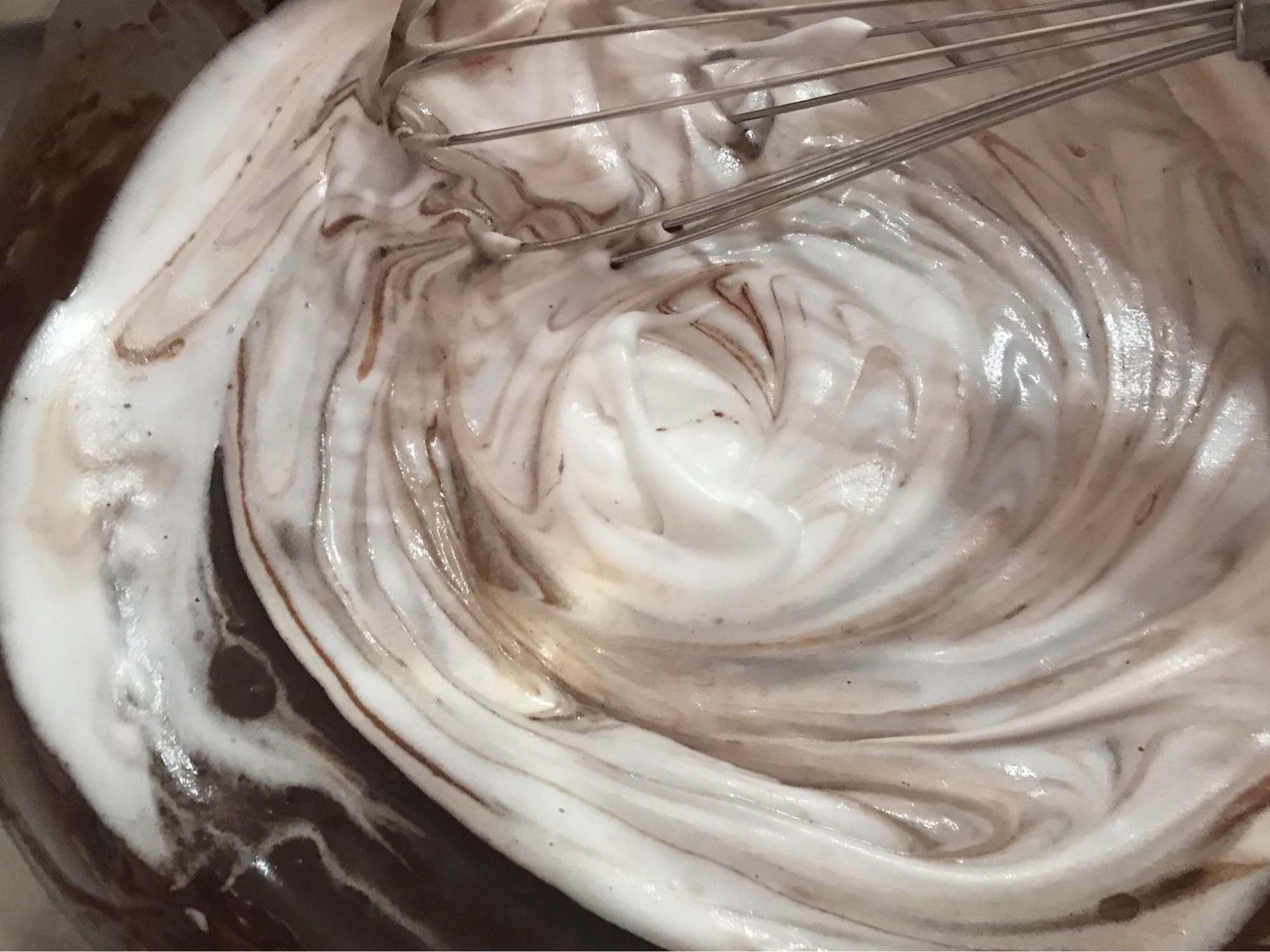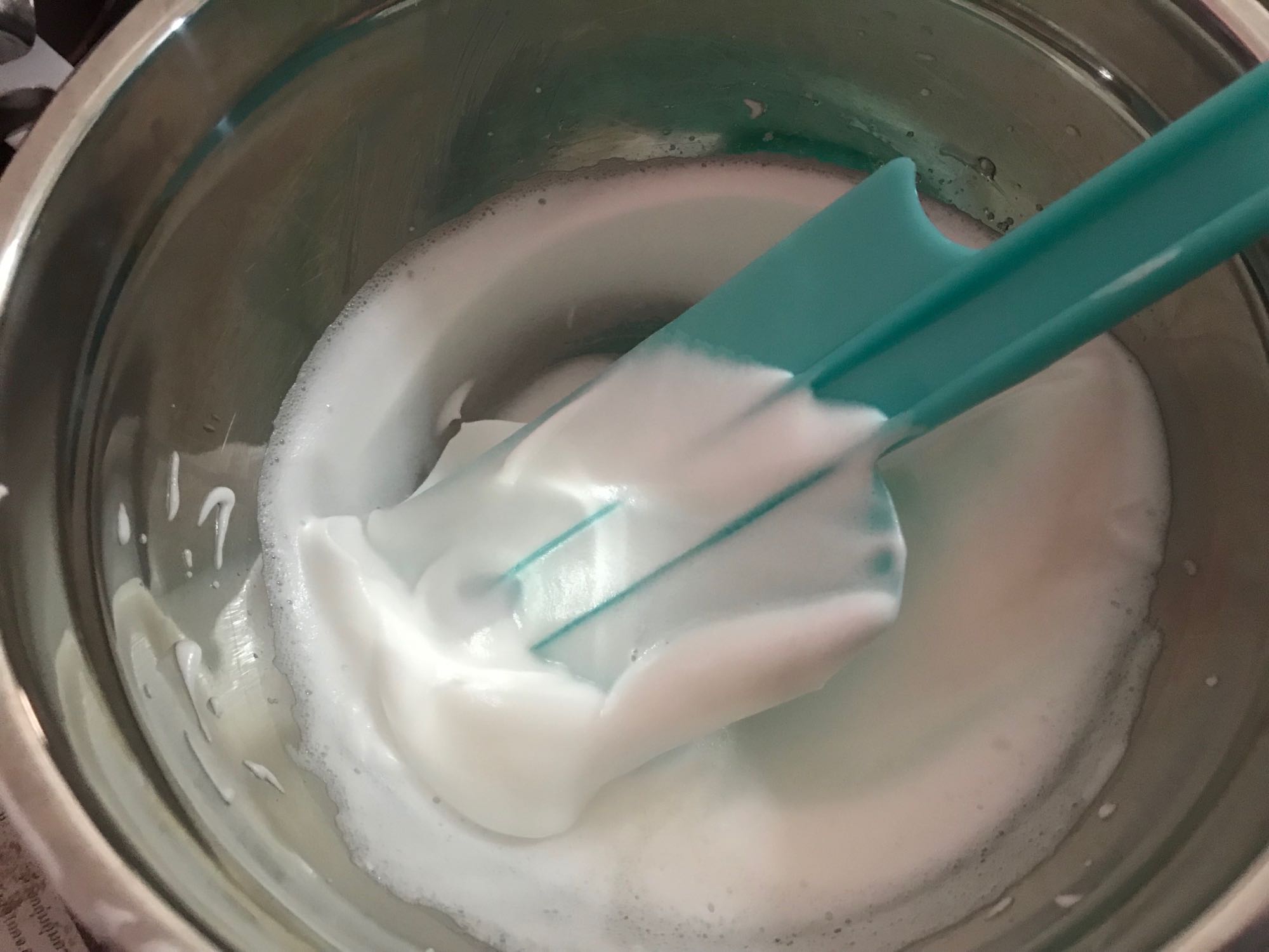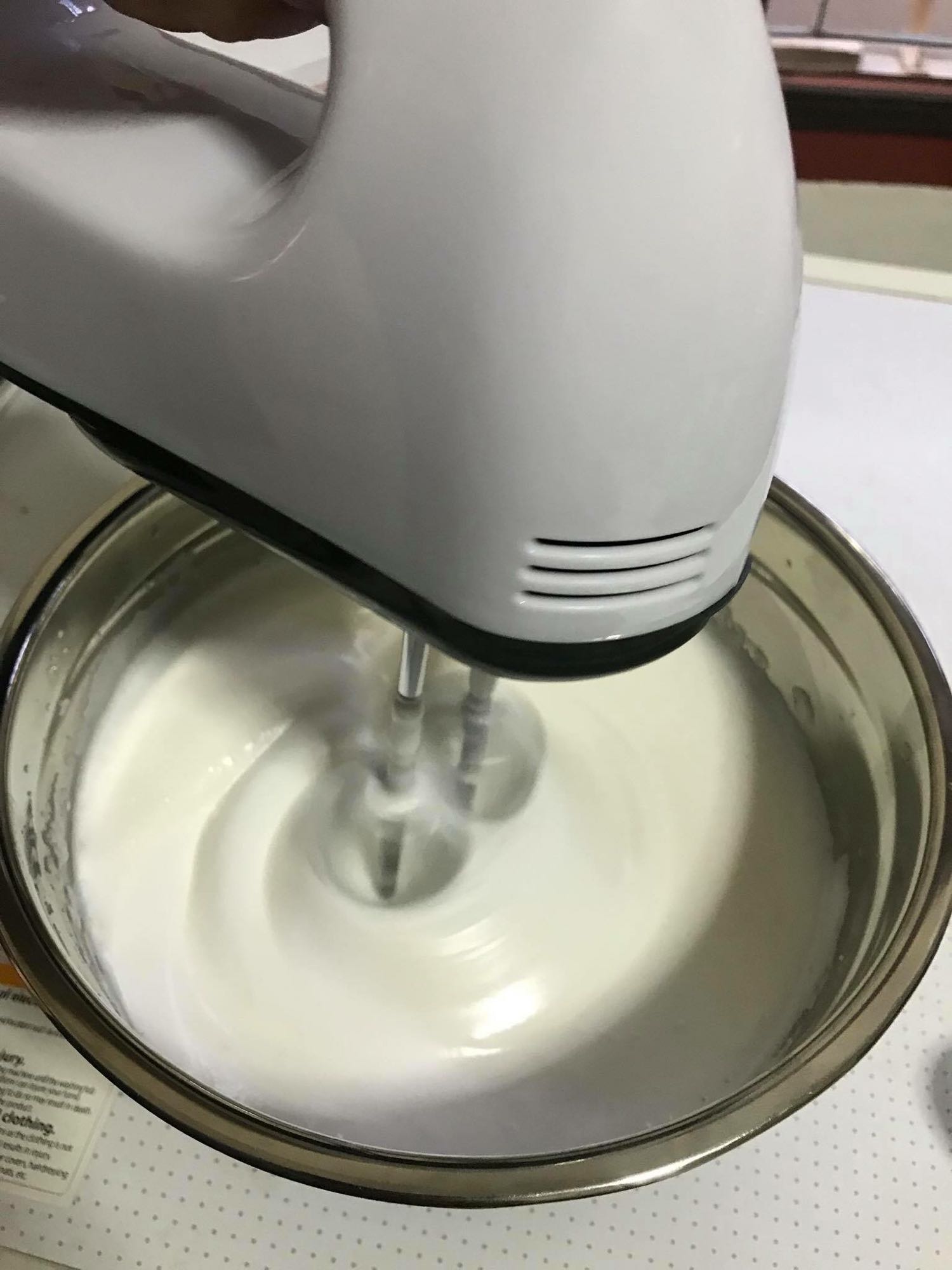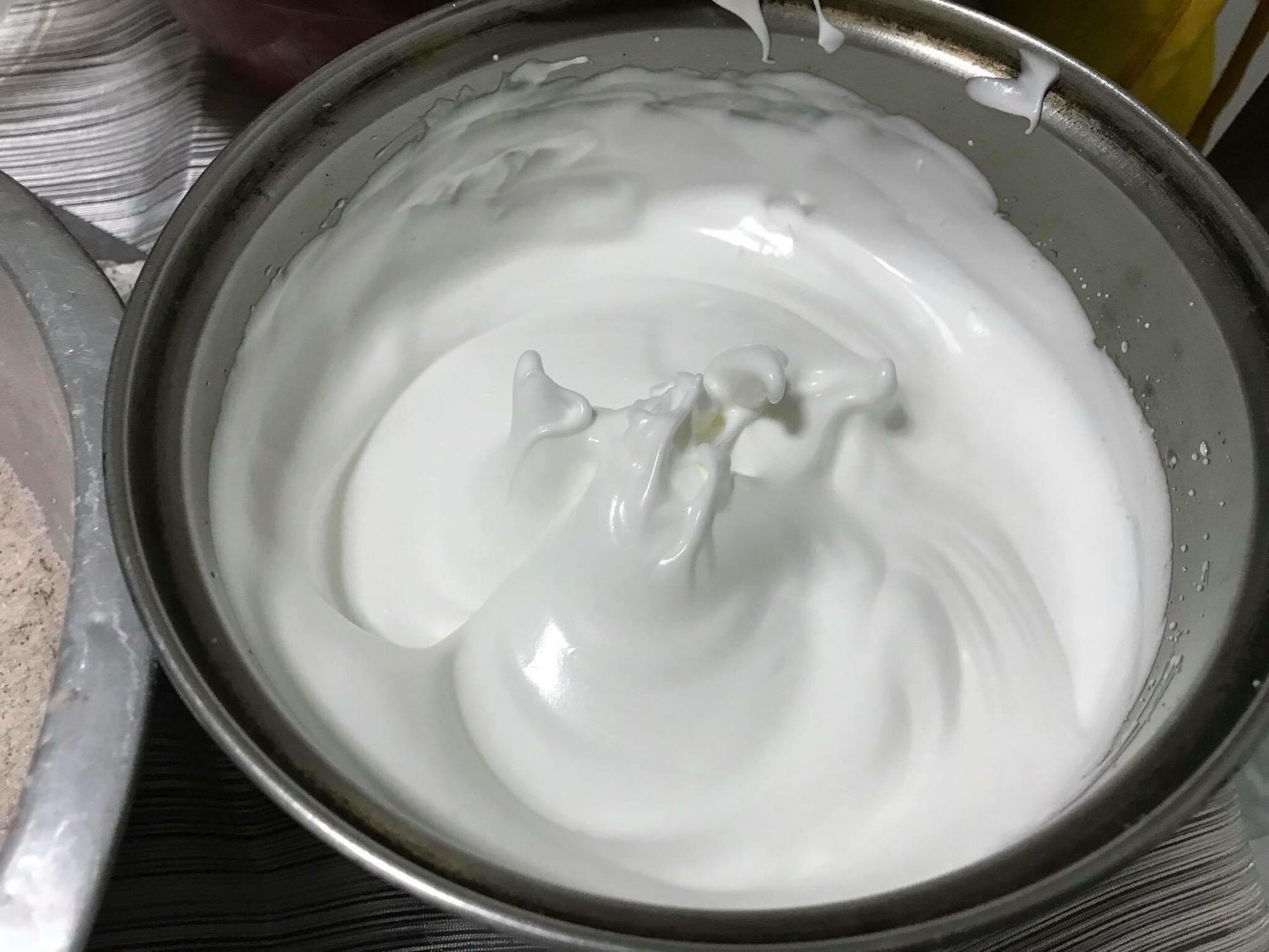 ขั้นตอนที่ 3 ตีไข่ขาวให้ตั้งยอดอ่อน (คือยกหัวตีออกแค่ให้ไข่ขาวงอเป็นรูปสระอาพอ ในรูปเป็นรูปหัดทำแรกๆ ยังไม่รู้หลัก ถ้าตีไข่เป็นยอดแข็งไป แป้งจะไม่นิ่มเท่าที่ควร)