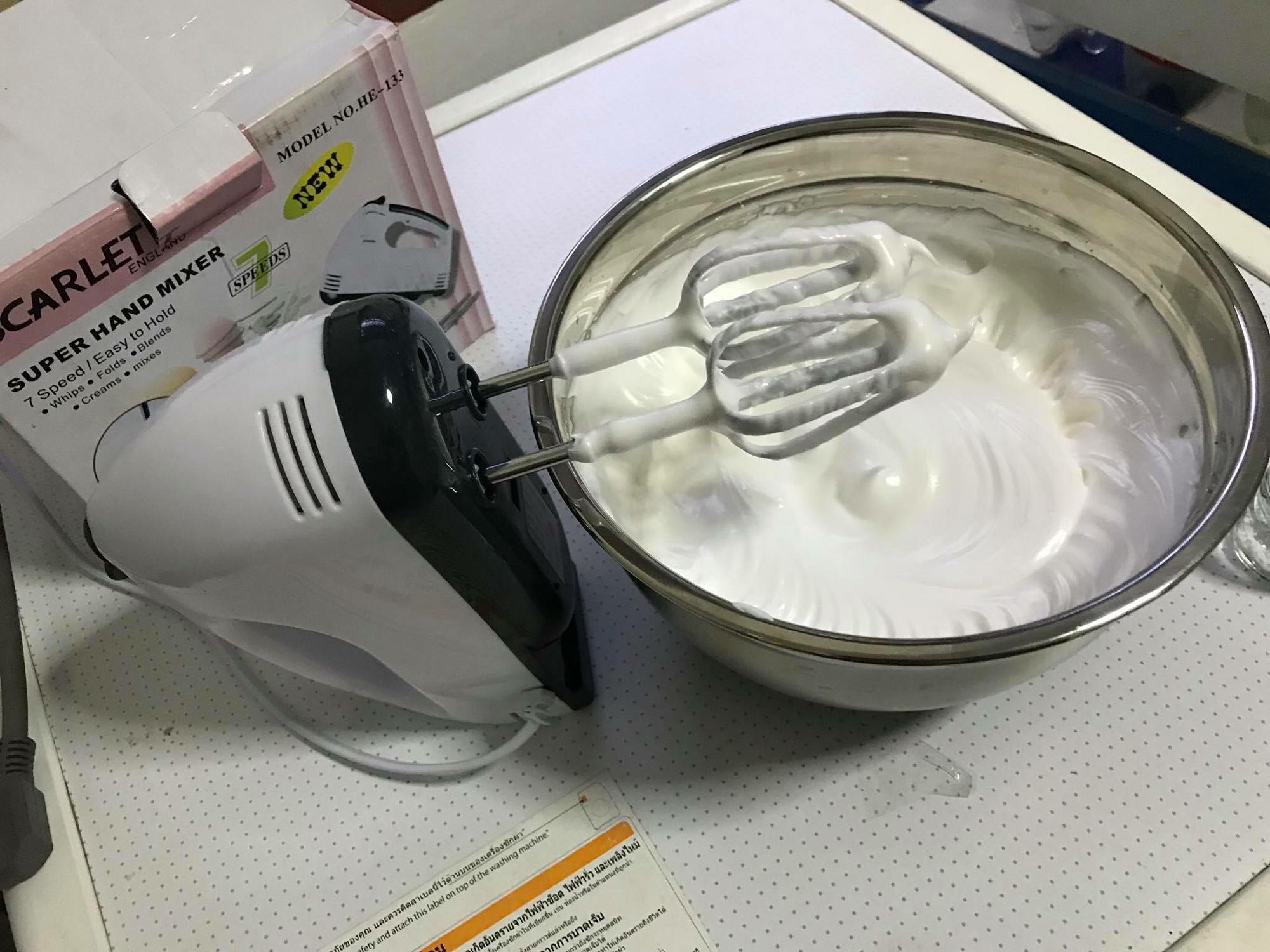 เมื่อใช้ตะกร้อ (หรือใช้พายก็ได้) คนให้ส่วนผสมทุกอย่างเข้ากันแล้ว