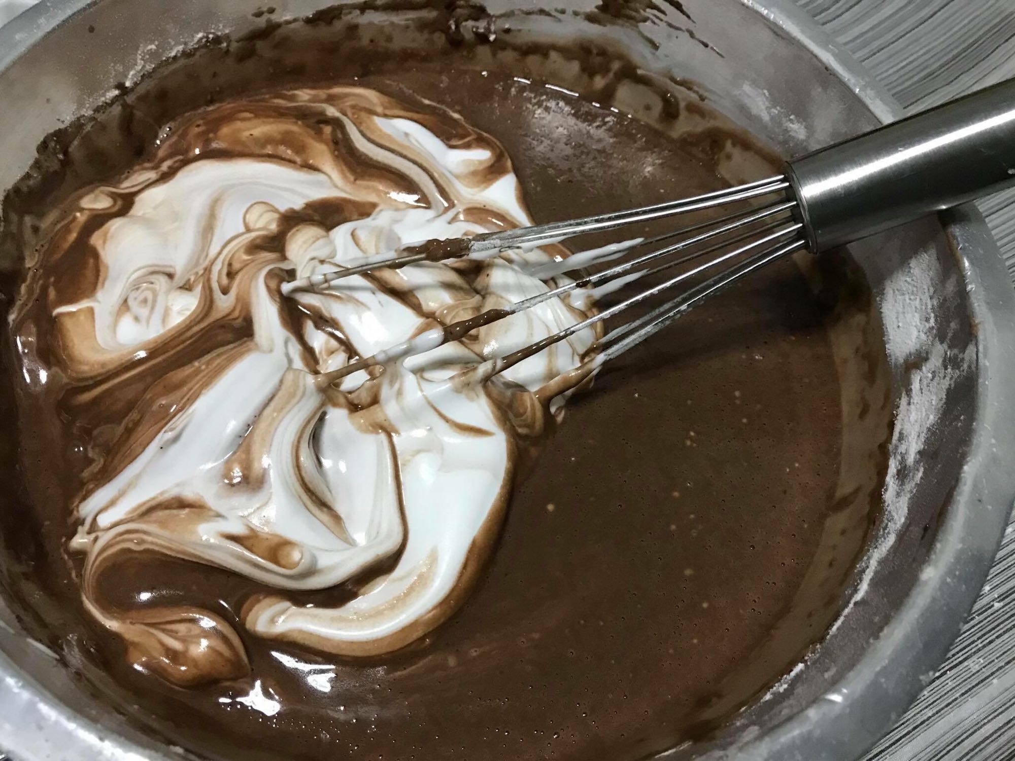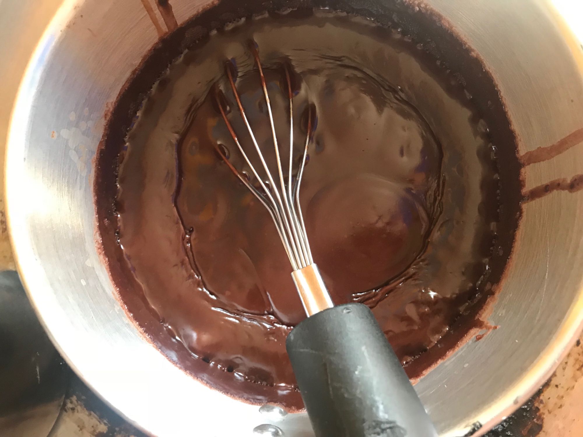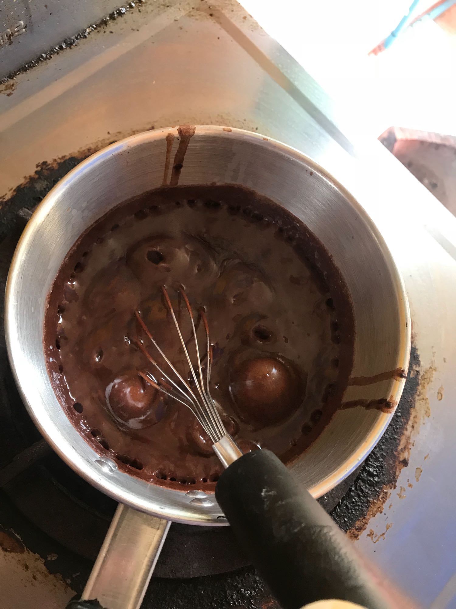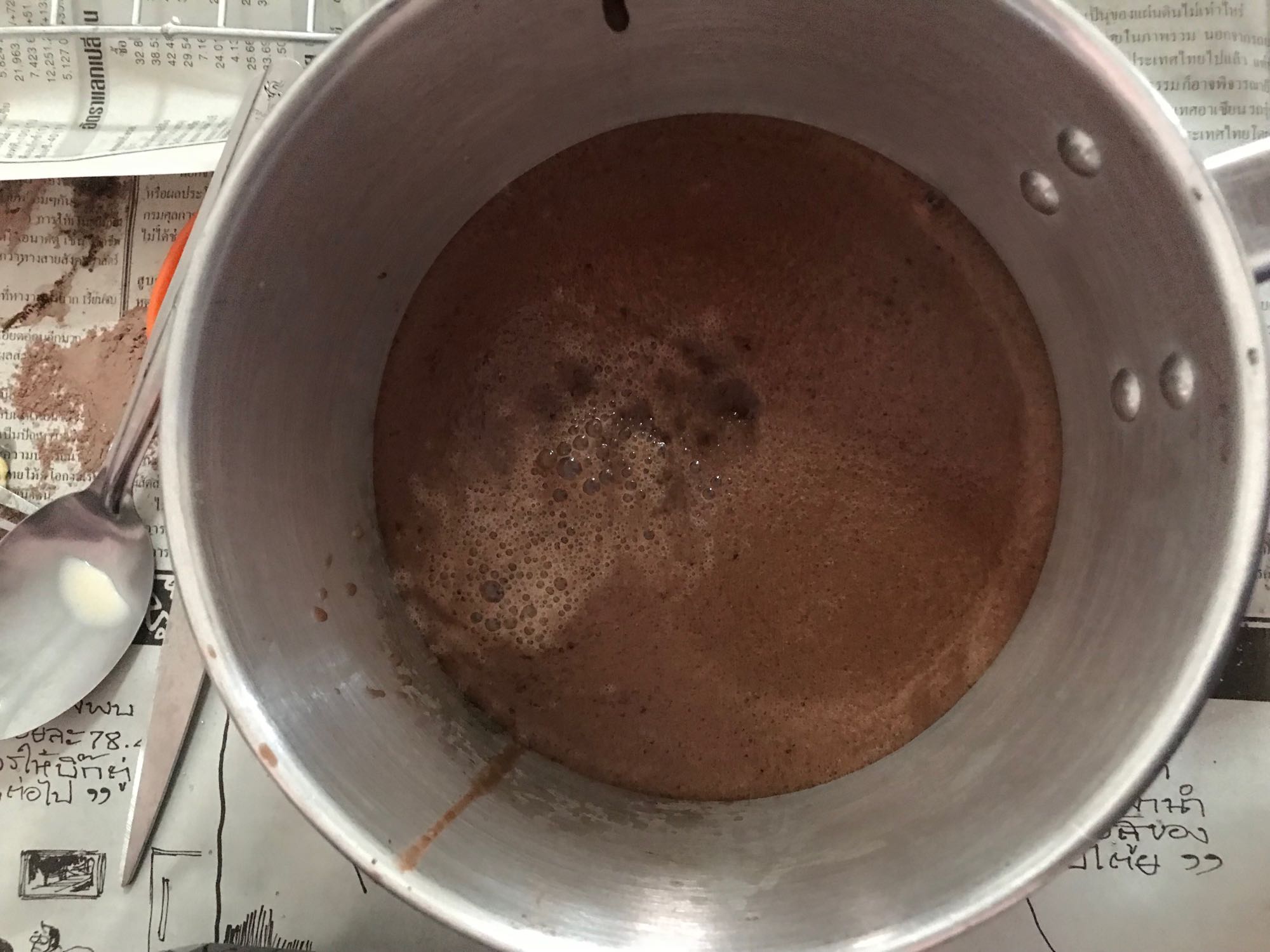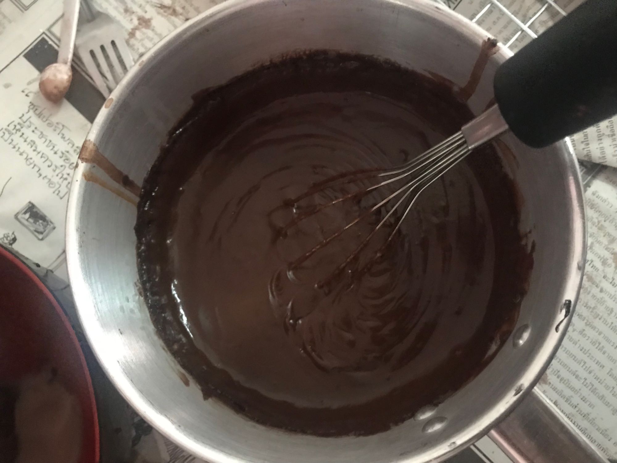 —-ระหว่างที่รอแป้งสุก ช่วงแรกๆ ที่หัดทำขนม เราไปทำหน้าช็อคเลย เลยมีบทเรียนมา ว่า ระหว่างที่รอแป้งอบสุก อย่าพึ่งไปทำหน้า เพราะขั้นตอนทำหน้าเป็นขั้นตอนที่ละเอียดอ่อน ต้องคนตลอดห้ามหยุดแม้แต่นาทีเดียว เดี๋ยวหน้าช็อคเกาะกันเป็นแผ่น รอให้แป้งสุก แล้วระหว่างให้แป้งหายร้อน ค่อยไปทำหน้าช็อค