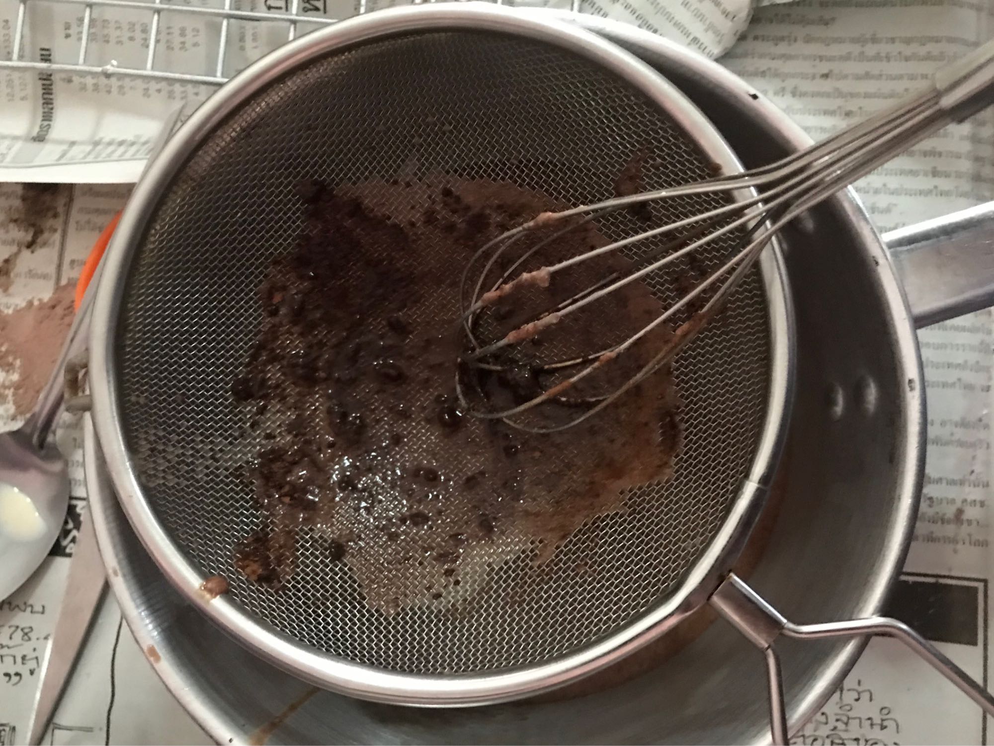 (ที่เขียนละเอียดขนาดนี้ เพราะตอนแรกเราไม่รู้เลยว่าใช้ตะแกรง 2 อัน เลยทำให้เราแต่งหน้าเค้กช็อคโกแลตที่ตูดเค้ก เปิ่นมะ บอกแล้วว่าเปิ่น) ^O^