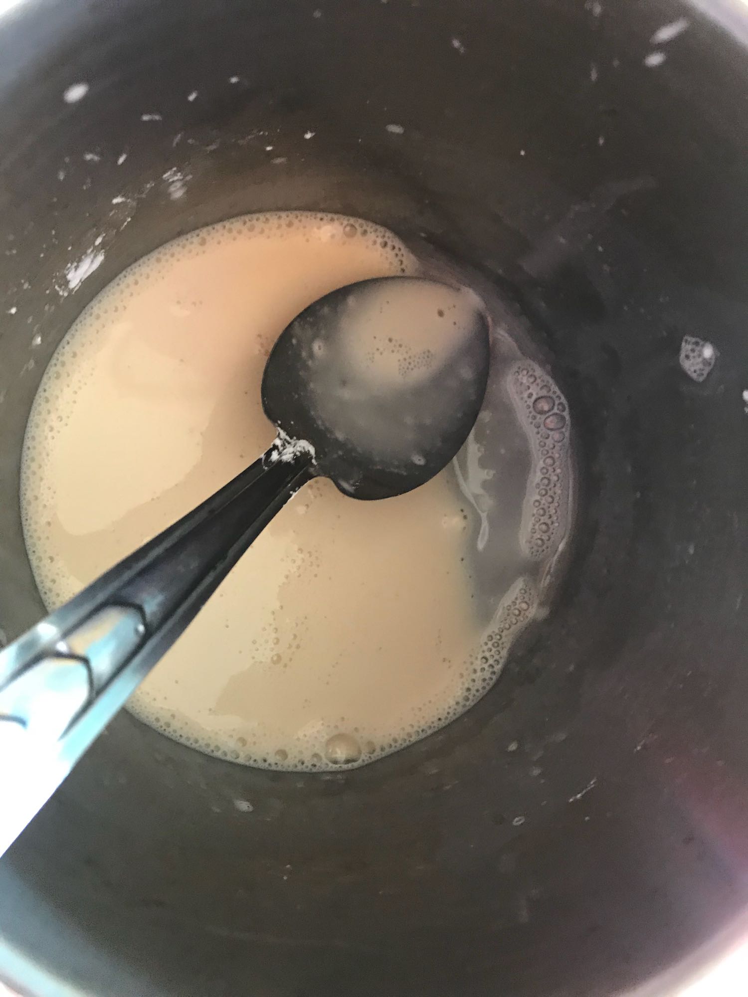 ระหว่างนั้น อีกมือก็คนนมกับแป้งข้าวโพดให้ละลายเข้ากัน