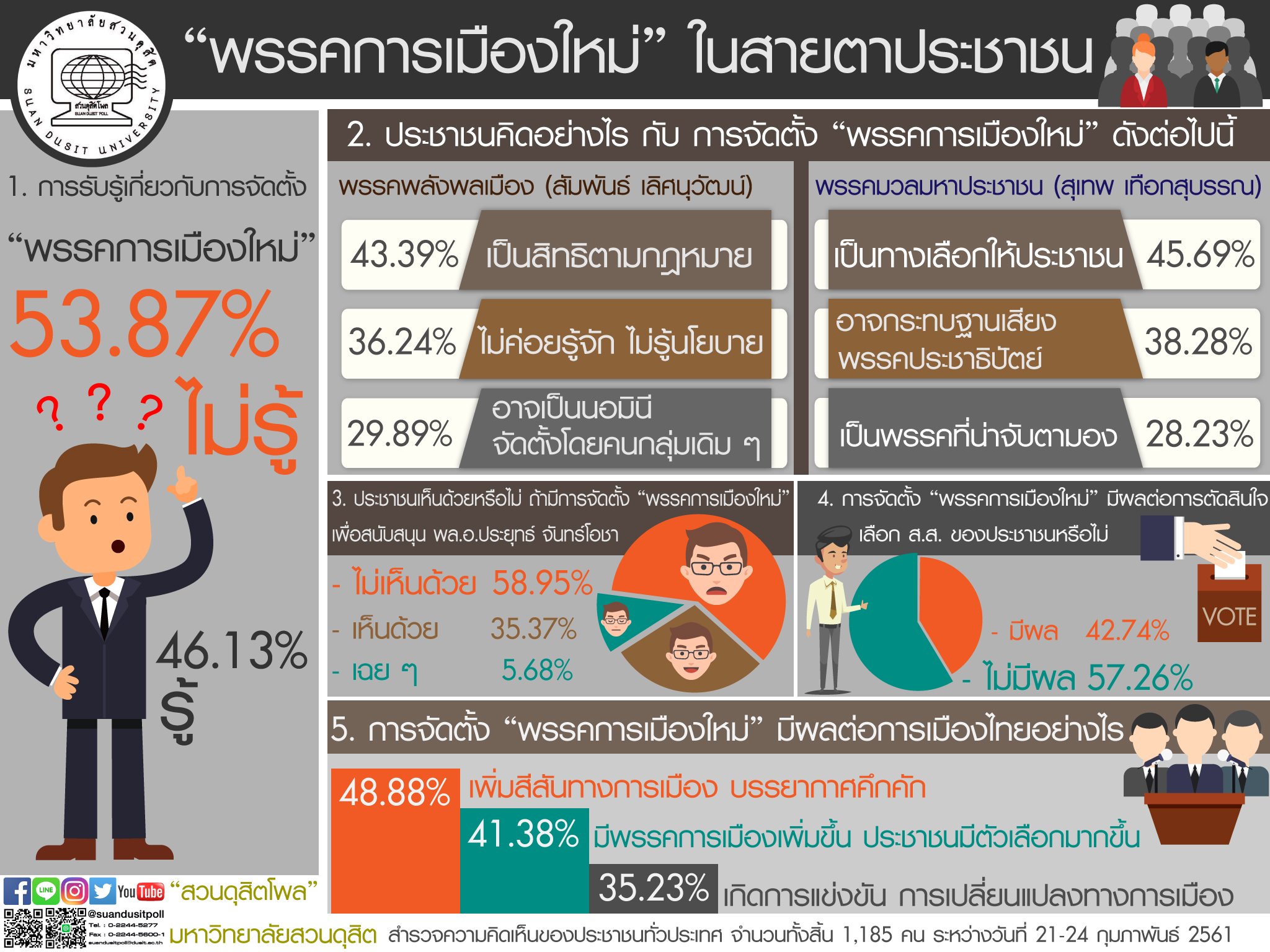 สวนดุสิตโพล มหาวิทยาลัยสวนดุสิต ได้สำรวจความคิดเห็นประชาชนทั่วประเทศ จำนวน 1,185 คน ระหว่างวันที่ 21-24 กุมภาพันธ์ 2561 เกี่ยวกับกระแสข่าวการตั้งพรรคการเมืองใหม่ ส่งผลให้บรรยากาสทางการเมืองไทยคึกคัก โดยเฉพาะการจัดตั้งพรรคใหม่ของนายสุเทพ เทือกสุบรรณ ที่ถูกจับตาและเป็นที่วิพากษ์วิจารณ์อย่างกว้างขวาง ซึ่งผลสำรวจ พบว่า