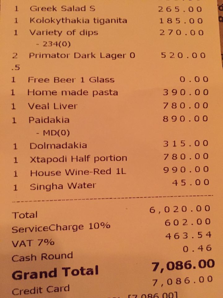 รสชาติของ ปลาหมึก เหมือนพึ่งออกจากมาจาก ช่องแช่แข็งเลยครับ ไม่มีรสชาติ ไม่มีความอร่อยเลย รสชาติเหมือนเคี้ยวยาง ผมเลยขอเรียกเจ้าของร้านมาคุยครับ ซึ่งเจ้าของร้าน (เป็นชาวกรีซ) บอกว่ามันเป็นเรื่องปกติ เพราะมัน import มาจาก สเปน ซึ่งผมก็ได้บอกเค้าไปว่ามันไม่ใช่นะ รสชาติมันแย่มาก ซึ่งเค้าดูไม่มีทีท่ารับผิดชอบอะไรเลยครับ ผมจึง ปล่อยไป คิดว่าราคาคง ไม่กี่ร้อย แต่เมื่อคิดเงินมา ผมตกใจมากครับ ปลาหมึก 2 ชิ้นนั้น ราคา 780 บาท