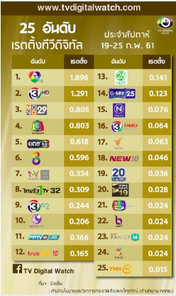 25 อันดับ เรทติ้งทีวีดิจิตัล 19 - 25 กุมภาพันธ์ 2561