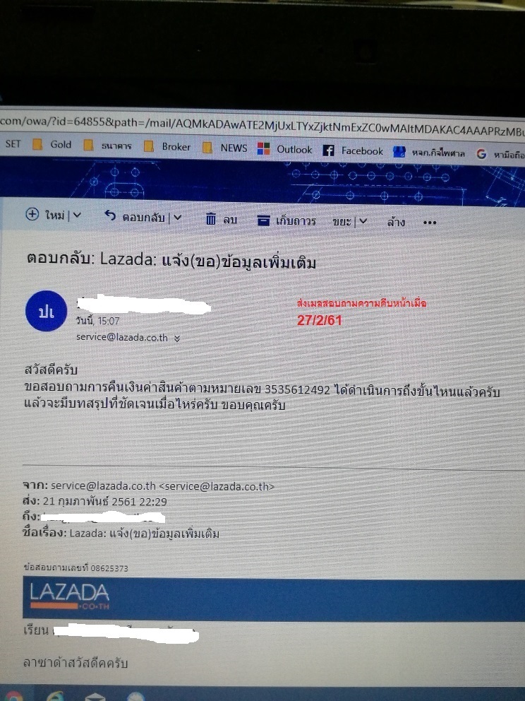 - ช่วงบ่าย Lazada ส่งเมลมาขอให้ส่งคืนสินค้ากลับเพื่อตรวสสอบ