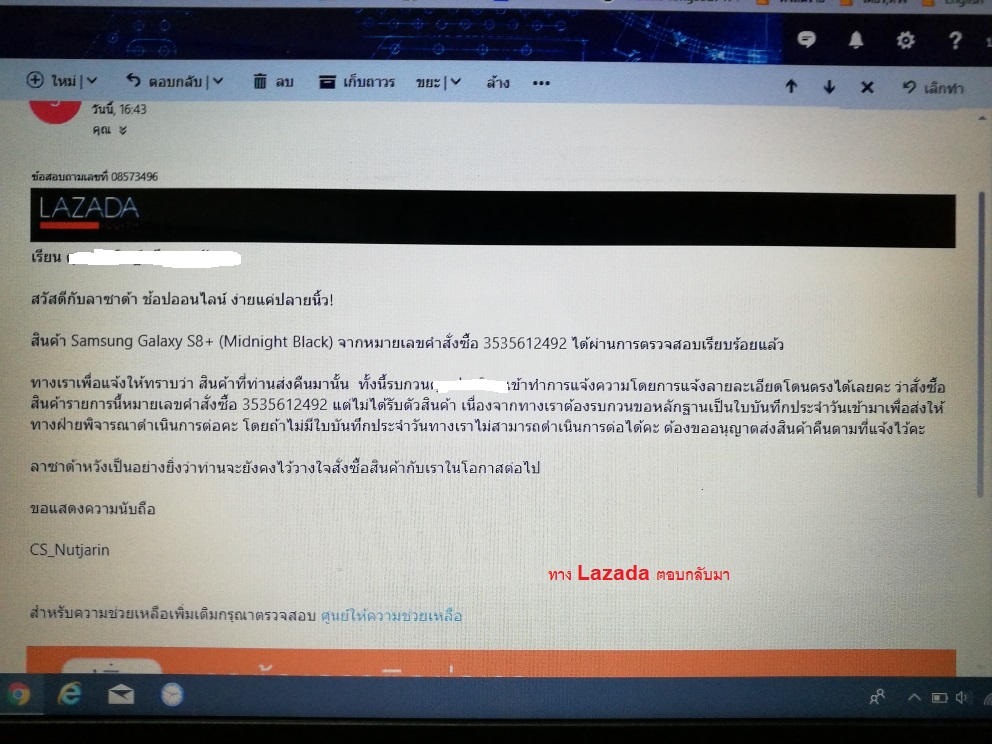 - Lazada เมลติดต่อมาเวลา 22:29 น. แจ้งว่า " ลาซาด้าขอเรียนให้ทราบว่า จากการตรวจสอบข้อมูลที่ท่านแจ้งมานั้น