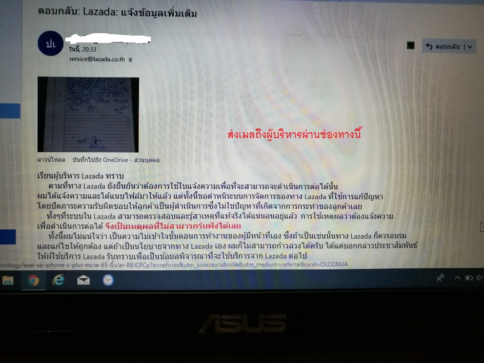 - ได้ส่งเมลแจ้ง Lazada ย้ำอีกครั้งว่า " กรณีนี้ ผมพยามยามอธิบายแล้วนะครับ ถ้าไม่เข้าใจให้ทางผู้บริหารโทรมานะครับ "