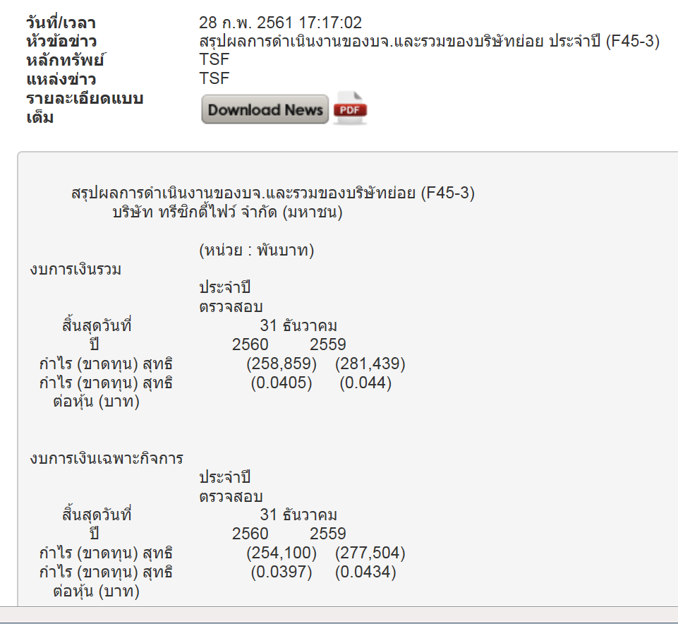 เป็นไปตาม ผบห คาดแล้ว ส่วนผู้ถือหุ้น 152.18 ล้านบาท พอเพียงรองรับขาดทุนจากผลประกอบการ 4/2560 ยังเหลือ 152.18 - 69.09 = 83.09 ล้านบาท รวมจำนวนเงินสุทธิได้จากขายหุ้นใหม่ 34.08 ล้านบาท รวม 117.17 ล้านบาท ถ้าเป็นไปตามอดีตไม่น่าพอเพียงรองรับขาดทุนในปี 2561 คิดว่า "ส่วนผู้ถือหุ้น" จะติดลบหลังปิดบัญชีไตรมาส 2/2561 ถึงกระนั้นก็ยังสามารถซื้อขายในกระดานได้จนกระทั่งส่งงบประจำปี 2561 ครบกำหนด 28/2/2562 จะโดน sp ฟื้นฟูการเงินยาว ยกเว้นต้องมีเงินจากการเพิ่มทุนไม่ว่า RO หรือ pp ได้รับก่อนปิดบัญชีประจำปี 2561 ทำให้ "ส่วนผู้ถือหุ้น" เป็นบวกในงบประจำปี 2561