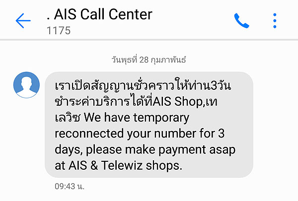 แต่แล้วในวันที่ 28 กุมมภา 2018 ในตอนเช้าผมมกลับไม่สามารถใช้สัญญาณมือถือ และ Internet ได้ ทำให้ผมโกรธมาก พอตอนสายมี SMS แจ้งว่าต่อสัญญาณให้ผมชั่วคราวเป็นเวลา 3 วัน