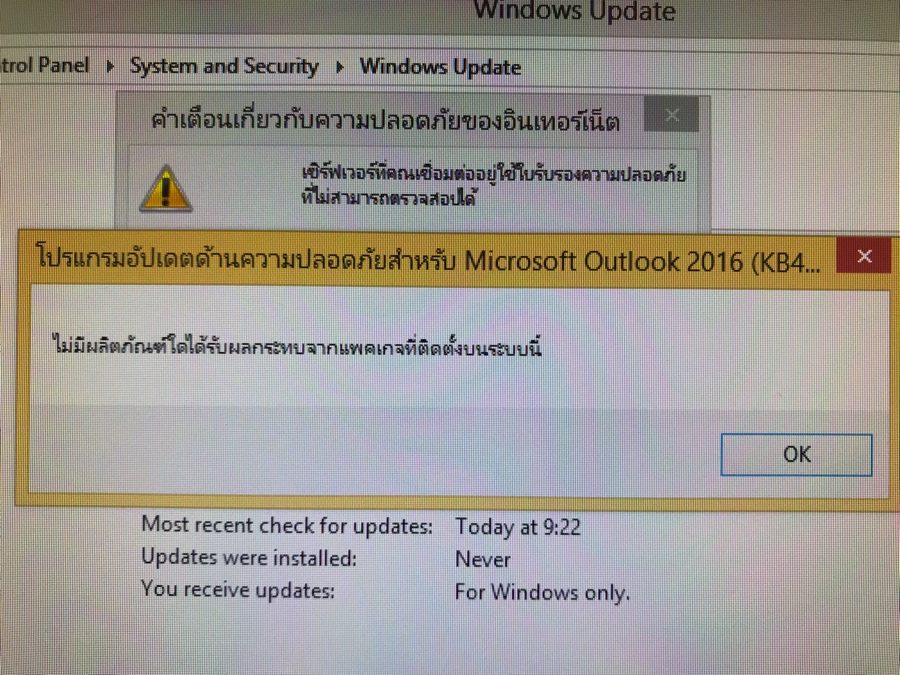 ทุกครั้งที่เปิดหรือรีเฟส outlook2016 จะมีป็อปอัพแจ้งเตือนขึ้นมาทุกรอบ ผมไปโหลดแพทแก้ไขก็ขึ้น”ไม่มีผลิตภัณฆ์ได้รับผลกระทบจากแพ็คเกจที่ติดตั้งบนระบบนี้” ผมจะแก้ไขยังไงไม่ให้ขึ้นแจ้งเตือนแบบในรูปครับ