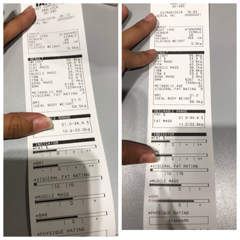 ผลปรากฏว่า นน เท่าเดิมเป๊ะ เมื่อเวลาผ่านไป เกือบ 1 เดือน สิ่งที่แตกต่างคือ !!' Fat % ต่างจากเดิม 2.1% 😍😍😍 ถึงเคยบอกว่า ลด นน ว่าง่ายนะ ลด แฟตยากกว่ามากๆๆ เอ๊ะ ... ทานิต้า ชั่งผิดรึเปล่า เลื่อนขัอมูลลงมาใหม่ เช็คได้ว่า กล้ามเนื้อขึ้นมา 1 กก ปละค่า TBW ขึ้นมา 2.1% ระบบการเผาผลาญเหมือนคนอายุ 20 !!! กรี๊ดดดด จากแต่ก่อนที่ เหมือนคนอายุ 32 !!! อาจจะเศร้าบ้างที่ นน ไม่ลง แต่ภาพรวม ถือว่า ดีใจนะ สำหรับตัวเอง เพราะฉะนั้น จึงอยากบอกเพื่อนๆว่า นน. ใช่ว่าสำคัญซะหมด สิ่งที่สำคัญคือ สัดส่วนในร่างกายมากกว่า ควรจะดูภาพรวมมากกว่าแค่ตัวเลขบนตราชั่งนะคะ แล้วเอามาเปรียบเทียบ กัน ไม่ได้ทำเพื่อให้เครียด แต่ให้ทำ เพื่อดูว่าเราจะปรับแก้ไขส่วนไหนของร่างกายได้บ้าง 😊😊 สู้ๆกันต่อไปน้าาาา