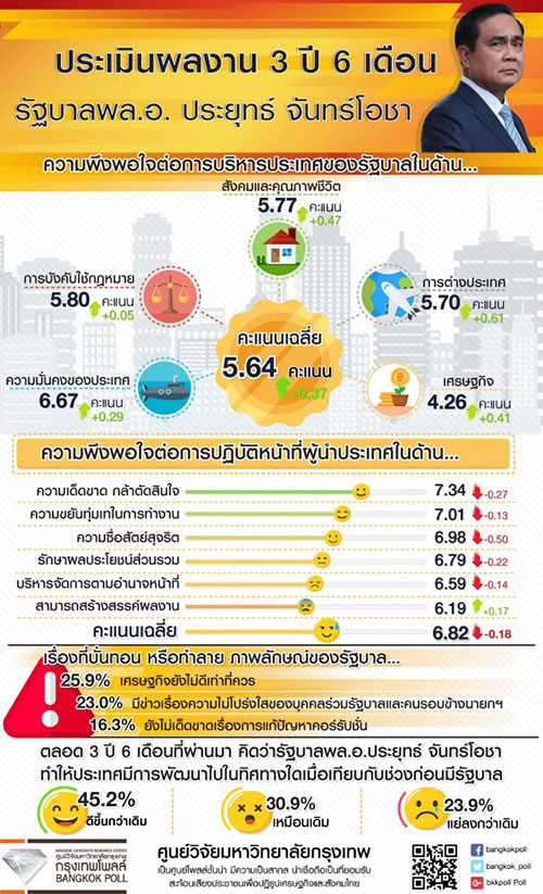 ในช่วง 3 ปี 6 เดือนเฉลี่ย 5.64 คะแนนจากคะแนนเต็ม 10 คะแนน ซึ่งเพิ่มขึ้นจากการประเมินการทำงานรอบ 3 ปี เดือนที่ได้ 5.27 คะแนนโดยการสำรวจครั้งนี้รัฐบาลได้คะแนนเพิ่มขึ้นทุกด้าน