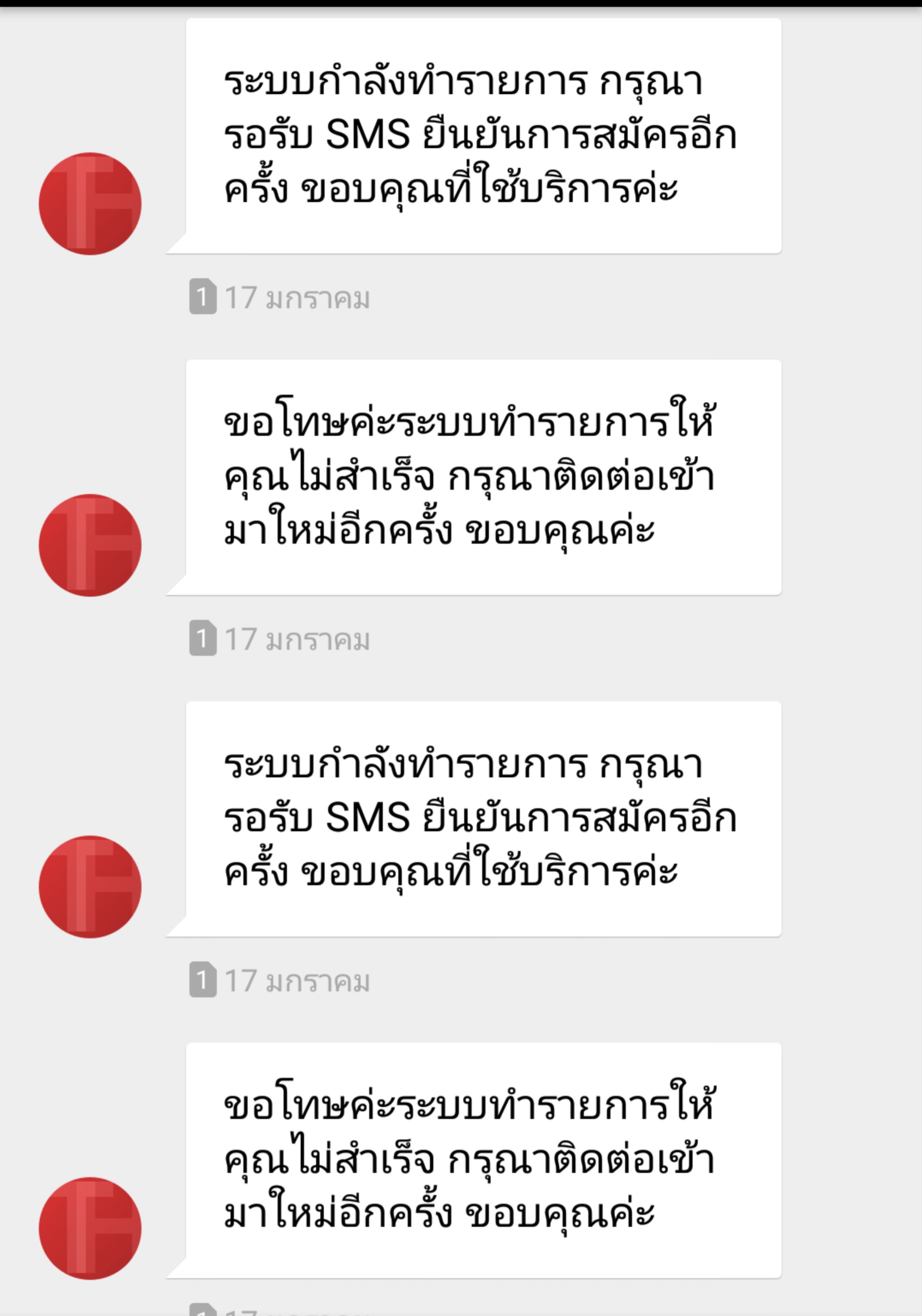 คนธรรมดาทั่วไปก็ต้องคิดว่าต้องทำรายการซ้ำถูกไหมครับ ผมจึงทำรายการซ้ำไปอีก 3 รอบ รวมเป็น 4 รอบ แล้วมี sms แจ้งมาทีหลังจากนั้นระยะเวลาประมาณนึงว่าผมทำรายการสำเร็จทั้ง 4 รอบ