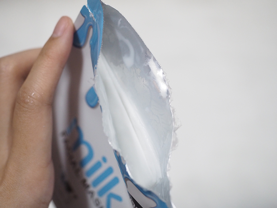 แล้วมาส์กหน้าอันนี้เพียงแค่แกะก็จะสัมผัสได้เลยค่ะว่า มันจะต้องชุ่มชื่นมากแน่ๆ เพราะว่า น้ำนมแน่นมากจริงๆ คือพอหยิบออกมาบอกเลยค่ะว่าต้องระวังมากๆ เพราะว่าตัวน้ำนมที่อยู่ในมาส์กหน้าหยดรัวๆเลยค่ะ ให้มาแบบจุใจมากๆ (แอบกระซิบว่าถ้าอยากประหยัดให้เอาแผ่นมาส์กเปล่าๆใส่ลงไปหมักยังสามารถใช้ได้อีกรอบด้วยนะ วิถีคนงก) แต่เชื่อเถอะค่ะว่า ใช้แบบซองต่อซอง หน้านุ่มจนหนุ่มยังหันมามอง