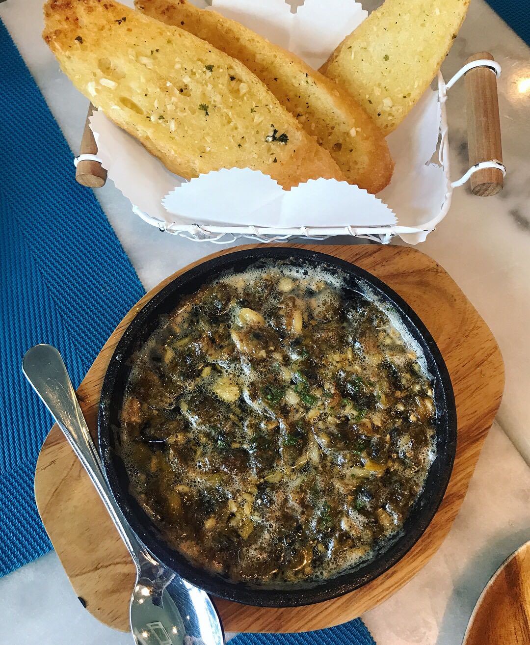 จานต่อมา....ไอเดียการเสิร์ฟแบบใหม่ของเมนู “หอยลายอบเนยกระเทียม (220 บาท)” คือผัดมาแล้วก็เสิร์ฟมาในจานร้อนเลย แต่การที่มันร้อนมากมันทำให้ตัวหอย overcooked ไปหน่อย แล้วจะเหนียวขึ้น บริหารกรามกันหน่อย (texture เหมือนหอยลายกระป๋อง) แต่รสชาติดีใช้ได้! 🥖🐚