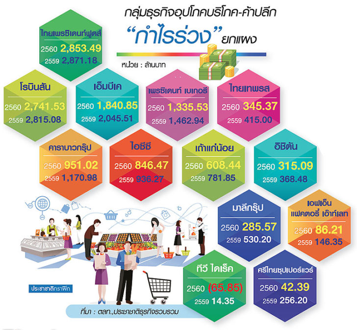 นอกจากนี้ บจ.ในกลุ่มสินค้าอุปโภคบริโภคและค้าปลีก พบว่าผลประกอบการออกมาส่วนใหญ่มีรายได้และกำไรสุทธิลดลงยกแผง สวนทางกับกลุ่มธุรกิจใหญ่อย่าง บมจ.ซีพี ออลล์ ผู้บริหารร้านเซเว่นอีเลฟเว่น และ บมจ.สยามแม็คโคร ในเครือ ซี.พี.ที่ผลประกอบการยังเติบโตอย่างต่อเนื่อง โดยซีพี ออลล์ มีกำไรสุทธิ 19,907.70 ล้านบาทเพิ่มขึ้นจากปีก่อนหน้าอยู่ที่ 16,676.51 ล้านบาท ขณะที่สยามแม็คโครมีกำไรสุทธิ 6,178.13 ล้านบาท เพิ่มขึ้นจากปี 2559 อยู่ที่ 5,412.52 ล้านบาท รวมทั้ง บมจ.เบอร์ลี่ ยุคเกอร์ หรือบีเจซี ของเจ้าสัวเจริญ สิริวัฒนภักดี ก็มีผลประกอบการเติบโตอย่างน่าสนใจ ด้วยตัวเลขรายได้ 164,198 ล้านบาท เพิ่มขึ้น 26,600 ล้านบาทหรือ 13.3% จากปีก่อนหน้า และมีกำไรสุทธิ 5,210.75 ล้านบาท จากปีก่อน 3,306.65 ล้านบาท โดยเรียกได้ว่าในกลุ่มธุรกิจสินค้าอุปโภคบริโภคและค้าปลีกมีเพียงธุรกิจเครือ ซี.พี.ของเจ้าสัวธนินท์ เจียรวนนท์ และกลุ่มของเจ้าสัวเจริญเท่านั้นที่สามารถเติบโตและกำไรเพิ่มขึ้นในอัตราที่สูง