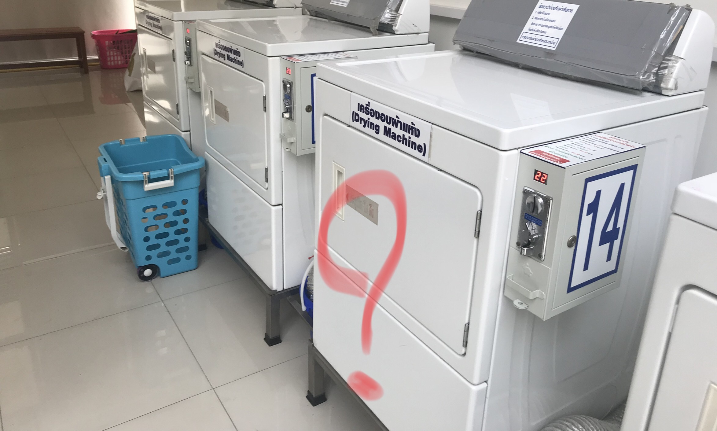 เลยสงสัยว่า แค่เอาตะกร้ามาวางไว้ เผื่อคนมาต่อคิวได้เอาผ้าออกแล้วจัดการของตัวเองต่อ ทำไมไม่เอาตะกร้ามาวางทิ้งไว้กัน??? กลัวตะกร้าหายเหรอ