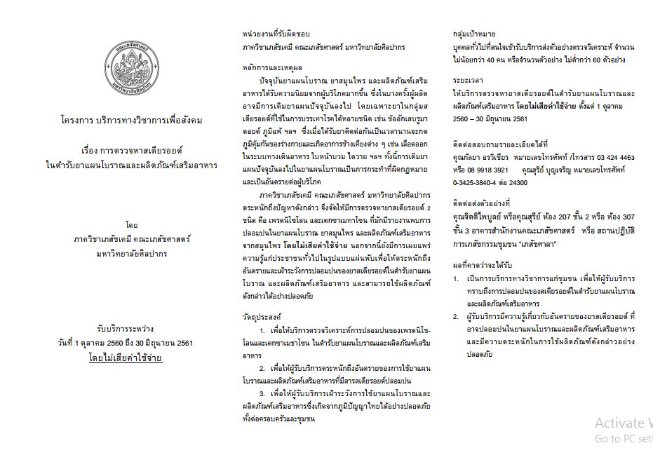 โครงการบริการทางวิชาการเพื่อสังคม เรื่องการตรวจหายาสเตียรอยด์ในตำรับยาแผนโบราณ และผลิตภัณฑ์เสริมอาหาร