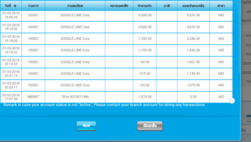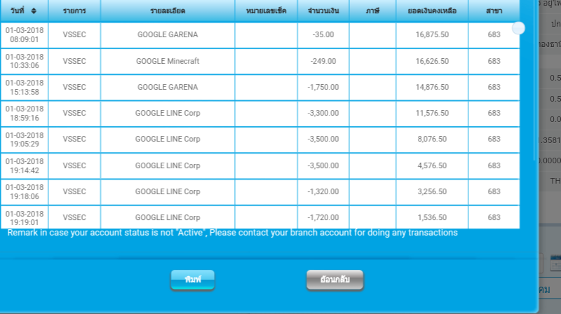 เรารีบโทร.ติดต่อไปยังธนาคาร ตามหมายเลขที่ให้ไว้ทันที ปลายสายเเป็น สนง.ใหญ่ ของธนาคารดังกล่าว เราเริ่มสอบถามข้อมูลเกี่ยวกับข้อความ sms ที่ได้รับ ทางเจ้าหน้าที่แจ้งว่า มีการทำรายการซื้อสินค้าผ่าน "Google line" โดยหักเงินจากบัญชีของเรา ของที่ซื้อมีสติ๊กเกอร์ และสินค้าในเกมส์ออนไลน์ ของ "Google line" เราจึงล็อกอิน เข้าระบบอินเทอร์เน็ตแบงค์กิ้งของธนาคารเพื่อเช็คยอดเงินคงเหลือ /เช็ครายการเดินบัญชีย้อนหลัง ปรากฎว่าเงินในบัญชีของเราถูกตัดยอดเงินไป ประมาณ 15,xxx บาท และคงเหลือยอดเงินในบัญชีขณะนั้นประมาณ 1,xxx บาท เราเองก็ตกใจสิ อยู่ๆเงินหายจากบัญชีได้ยังไง เลยมาเช็คที่รายการเดินบัญชี ในรายละเอียดมีการหักเงินออกจากบัญชีในวันที่1 มีนาคม 2561 และ วันที่2 เดือนมีนาคม 2561 ในรายการเป็นการหักเงินจาก Google Line corp , google garena และ google minecraft