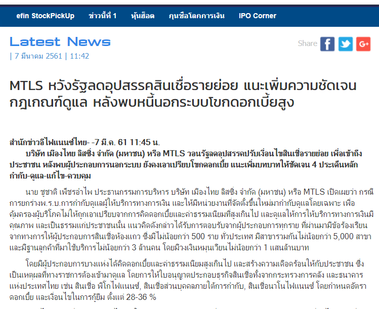 บริษัท เมืองไทย ลิสซิ่ง จำกัด (มหาชน) หรือ MTLS วอนรัฐลดอุปสรรคปรับเงื่อนไขสินเชื่อรายย่อย เพื่อเข้าถึงประชาชน หลังพบผู้ประกอบการนอกระบบ ยังคงเอาเปรียบโขกดอกเบี้ย แนะเพิ่มบทบาทให้ชัดเจน 4 ประเด็นหลัก กำกับ-ดูแล-แก้ไข-ควบคุม