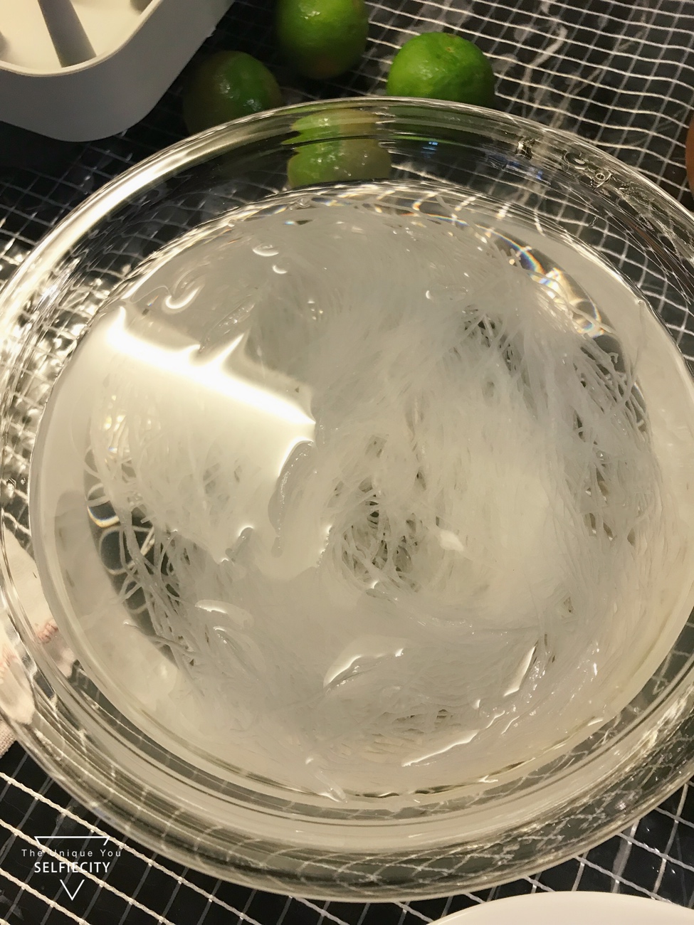 มาเริ่มกันเลยค่ะ เอาวุ้นเส้นแช่น้ำทิ้งไว้ 20 นาทีกว่าๆแล้วค่ะ มั่วแต่ทำโน้นทำนี่ ไม่ต้มนะคะเพราะมันนิ่มไป เลยใช้แช่น้ำเอา พอได้ที ก็ตั้งกะทะ