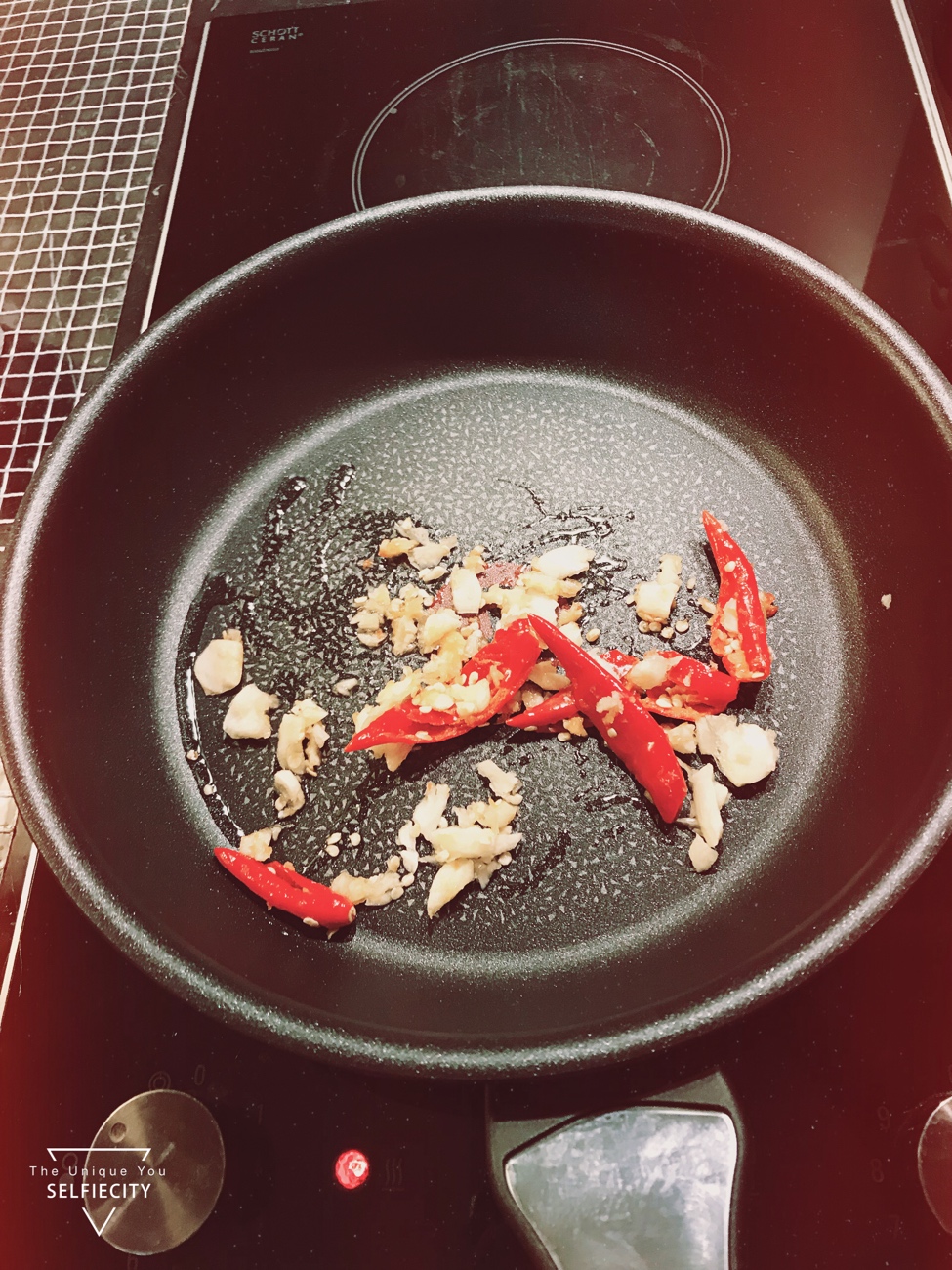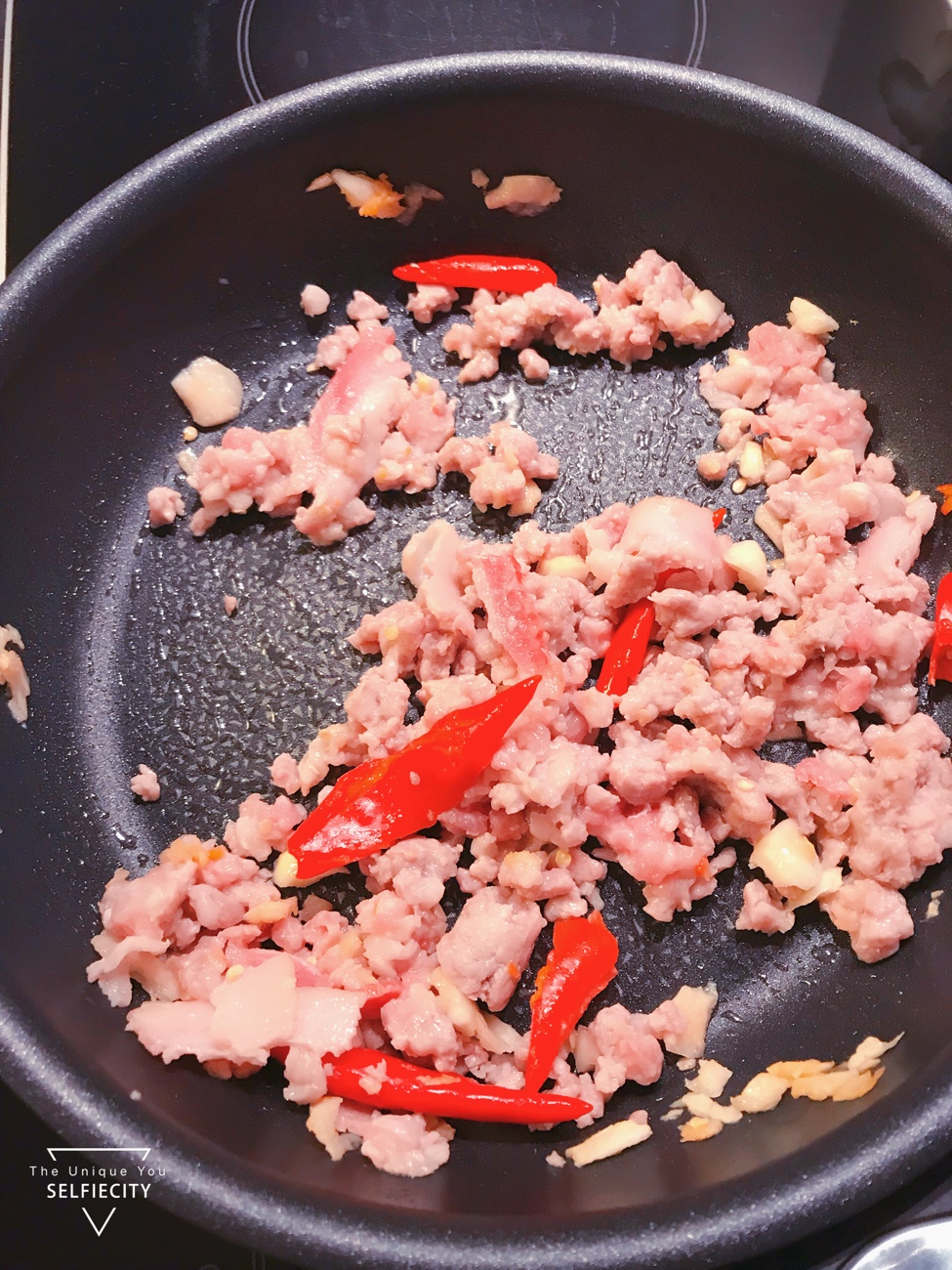 ใส่น้ำมันพอดีไม่ต้องเยอะค่ะ ตามด้วยพริกกระเทียม พอได้กลิ่นหอมก็ตามด้วยหมูสับ