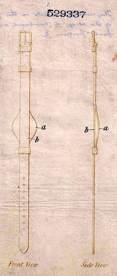 แล้วผมก็ไปเจอคนที่ได้ค้นหาข้อมูลเกี่ยวกับเจ้าสาย G10 นี้ เขาพบว่า มันมีสายหน้าตาคล้ายๆกันอยู่ คือ เป็นสายแบบเส้นเดียว มีชิ้นล่างที่เย็บติด และมีห่วงเพื่อสอดเข้าที่ปลายสายเข้ามาล็อคตัวนาฬิกาเอาไว้เหมือนกัน ซึ่งสายนี้ถูกจดสิทธิบัตรการออกแบบ (Registered Design) เลขที่ 529336 ใน British Board of Trade เมื่อวันที่ 27 สิงหาคม 1908 โดยบริษัท E. J. Pearson and Sons และได้ทำออกขายในชื่อ "Victor" สายในรูปข้างล่างมีปั๊มคำว่า "VICTOR 529336" และ "Made in England" อยู่