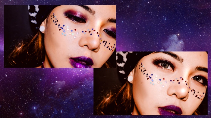 STEP 7 สำหรับคนที่อยากเพิ่มลูกเล่น สีม่วงอาจจะเป็นดวงดาวกาแลคซี่ก็เป็นได้ เราก็เพิ่มดาวหลากสีเข้าไป มีความเก๋และความสวยงามเข้าไปอีกจ้า อย่าลืมไปเล่นกันได้นะคะ